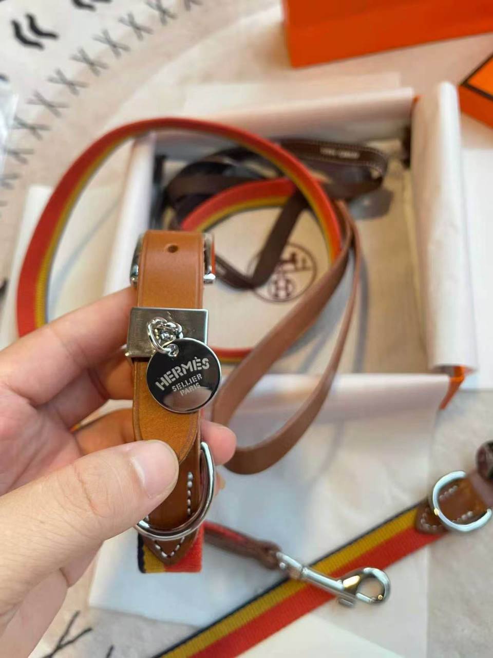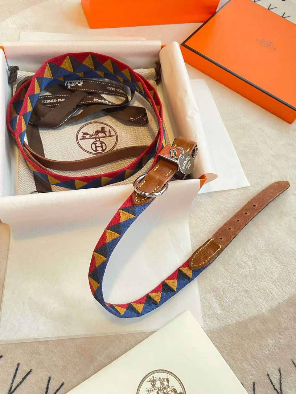 Ошейник от Hermes – это стильный аксессуар для вашего питомца, сочетающий в себе элегантность и практичность. Он идеально подходит для повседневных прогулок, обеспечивая комфорт и безопасность вашему любимцу.