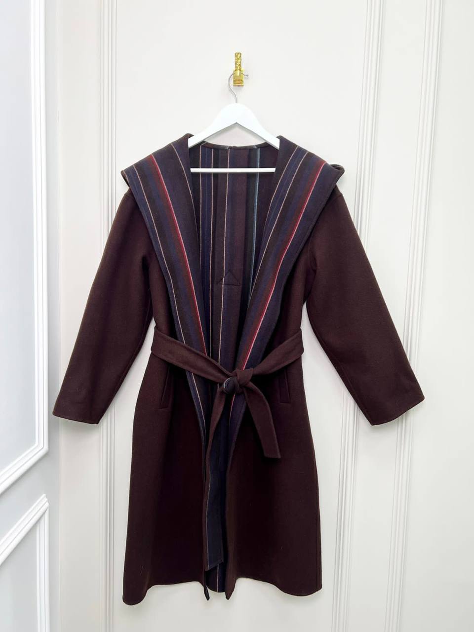 Пальто Hermes LUX-77440 — это стильное пальто из осенне-зимней коллекции, представленное в глубоком коричневом цвете. Пальто имеет пояс, который подчеркивает талию, капюшон и контрастную подкладку, добавляющую изысканности. Этот предмет гардероба идеально подойдет для создания элегантных и теплых образов.