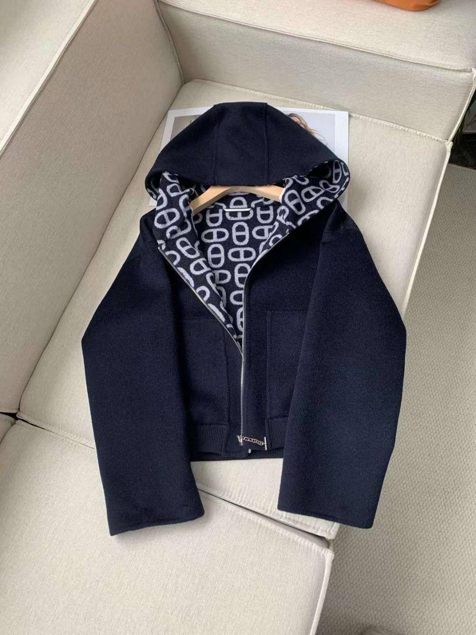 Пальто Hermes LUX-109665 — это стильная и современная куртка. Темно-синий цвет гармонично сочетается с капюшоном, декорированным графическим принтом. Куртка имеет удобный фасон с застежкой-молнией и практичным дизайном, что делает ее идеальным выбором для повседневного использования.