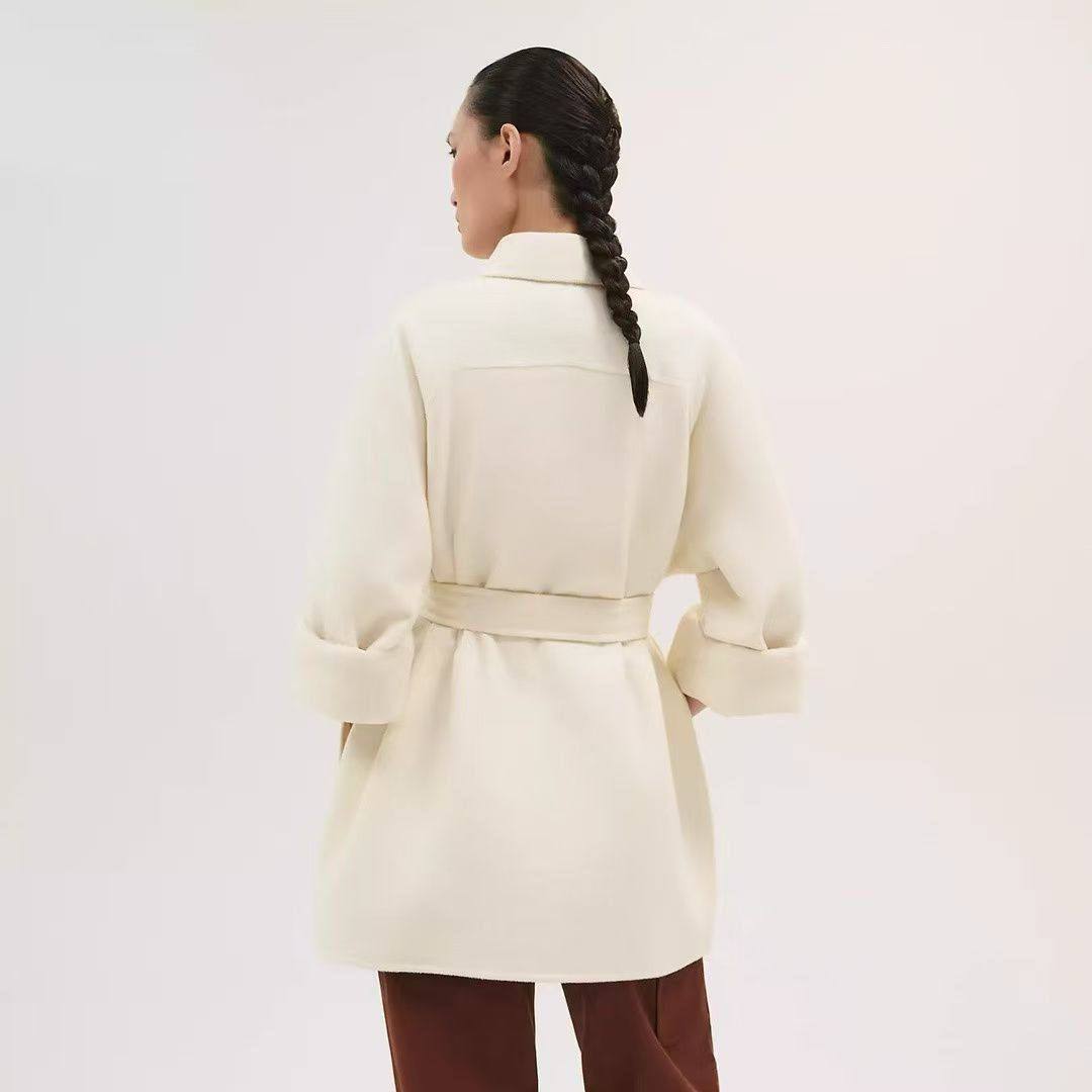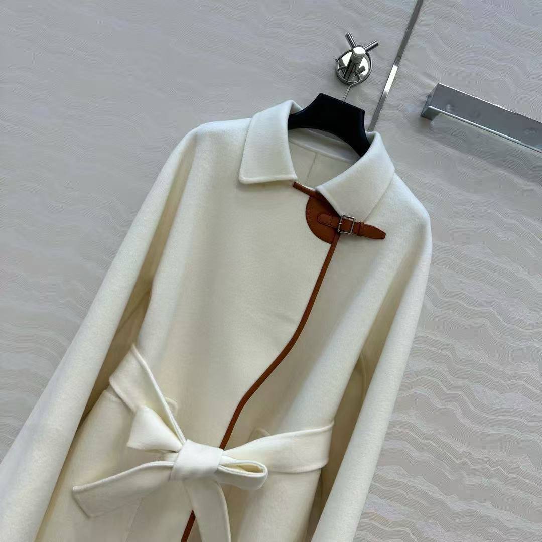 Белое пальто от Hermes – это воплощение элегантности и утончённого стиля. Лаконичный дизайн, подчеркнутый коричневыми кожаными элементами, делает его универсальным выбором для создания неповторимого образа.