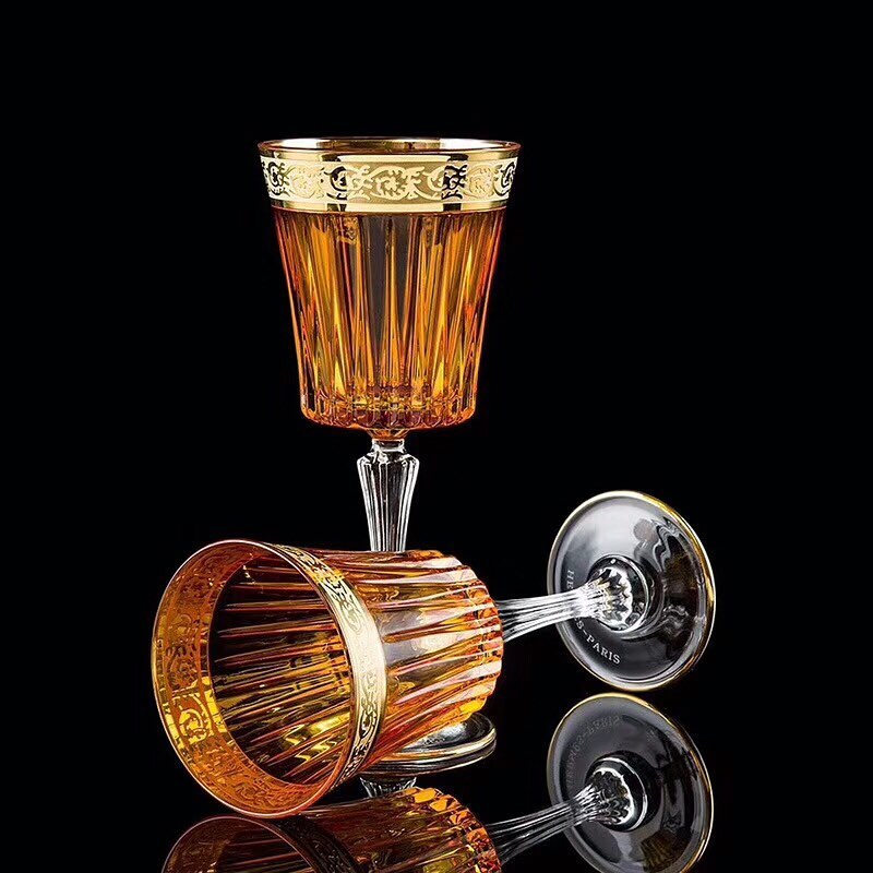 Пара фужеров Hermes LUX-31466 представляет собой изысканный набор, выполненный в классическом стиле с элементами роскоши. Фужеры окрашены в насыщенный янтарный цвет и декорированы золотистым орнаментом по верхнему ободку, что придает им элегантный и утонченный вид. Граненые стенки чаши отражают свет, создавая игру бликов и подчеркивая благородство напитка.