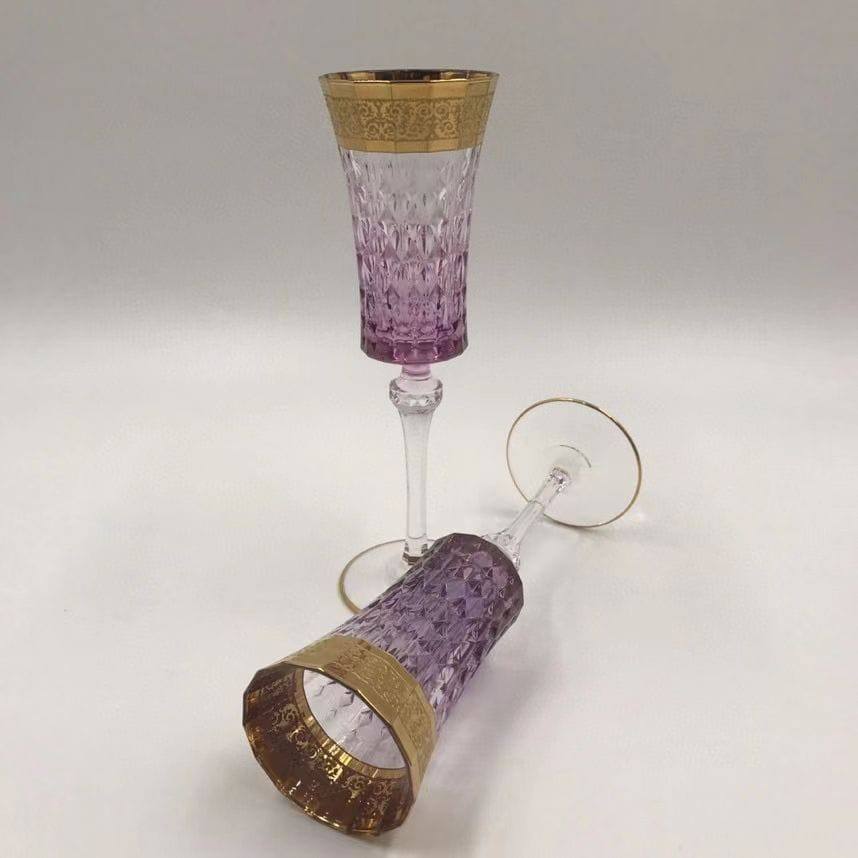Пара фужеров Hermes LUX-100042 — это элегантный набор, предназначенный для торжественных случаев и особых моментов. Фужеры выполнены в классическом стиле, сочетающем прозрачное стекло с нежным фиолетовым оттенком и золотыми декоративными элементами. Их изящная форма и утонченный дизайн создают атмосферу изысканности.