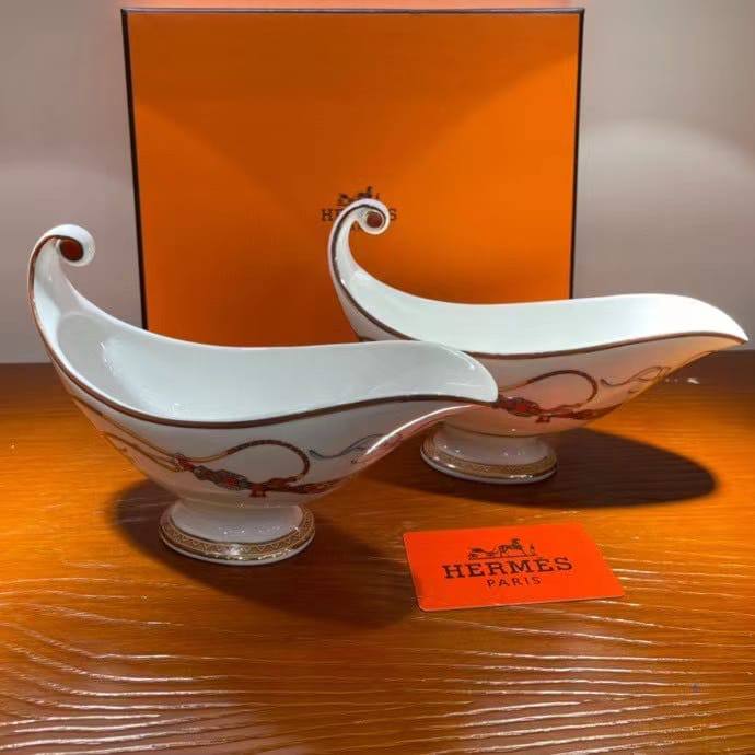 Пара соусников Hermes LUX-78384 представляет собой элегантный набор для сервировки стола, выполненный в изысканном стиле. Соусники имеют белый цвет с декоративным золотистым и терракотовым узором. Их форма напоминает небольшие лодочки с изящной ручкой-завитком, что придает им особый шарм. Предназначены для подачи соусов, подлив, или других жидких добавок к блюдам.