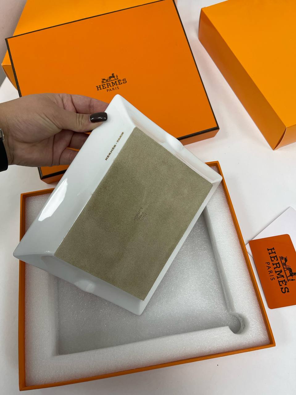 Пепельница 20*17см Hermes LUX-90387 - это изысканный аксессуар, который сочетает в себе функциональность и роскошный дизайн. Эта пепельница от Hermes выполнена в фирменном стиле бренда, который характеризуется элегантностью и утонченностью. Серебристо-белый фон с золотистым узором и логотипом по центру добавляют нотку роскоши.