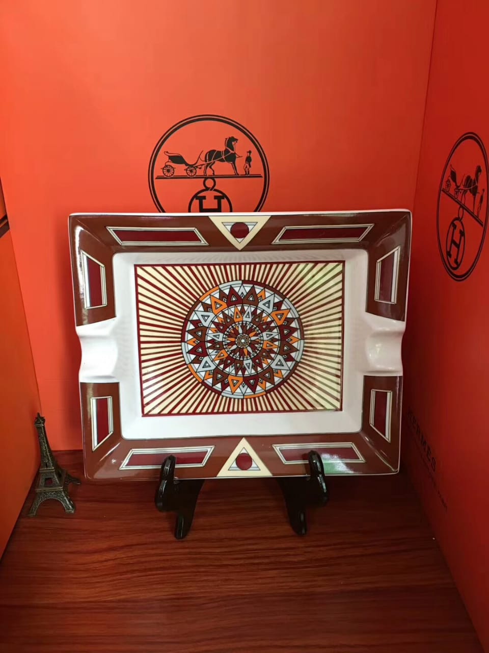 Эта пепельница Hermes LUX-19730, выполненная в уникальном стиле, представляет собой изысканный предмет интерьера. Она украшена ярким геометрическим узором в центре, напоминающим солнечный диск, и обрамлена коричневой каймой с белыми и красными вставками, добавляющими ей элегантности.