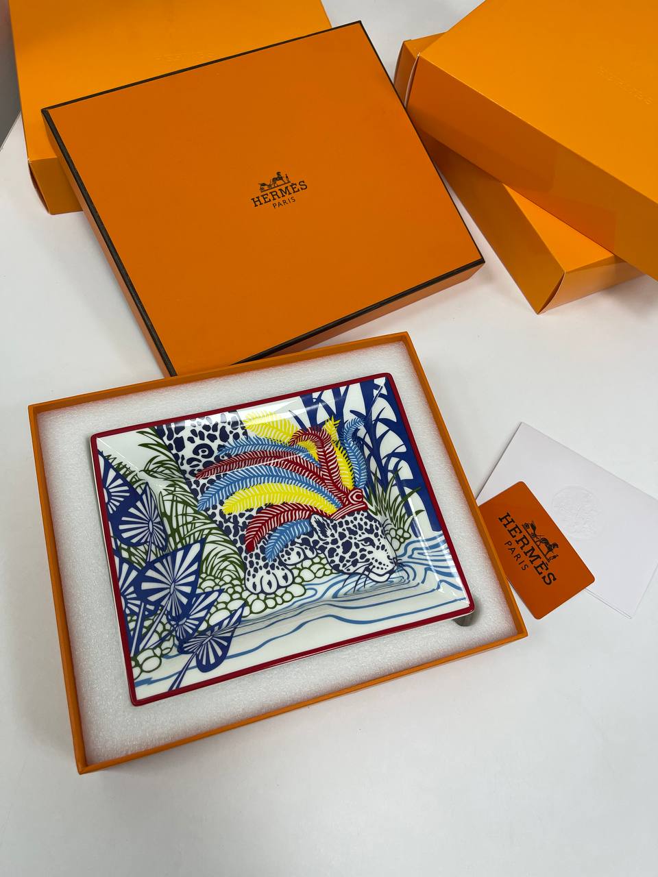 Пепельница Hermes LUX-80663 – это изысканный аксессуар для ценителей роскоши, который сочетает в себе функциональность и художественное оформление. Квадратная пепельница выполнена в ярких тонах с изображением леопарда и экзотической растительности, что придает ей уникальный вид.