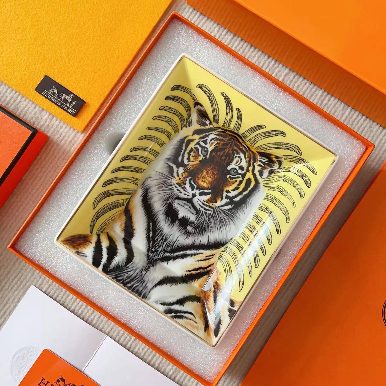 Пепельница Hermes LUX-110018 представляет собой изысканный аксессуар для дома, сочетающий в себе функциональность и художественную ценность. Желтая пепельница прямоугольной формы украшена красочным изображением тигра, создавая яркий акцент в интерьере. Она выполнена в фирменном стиле Hermes и может служить не только по прямому назначению, но и как декоративный элемент.