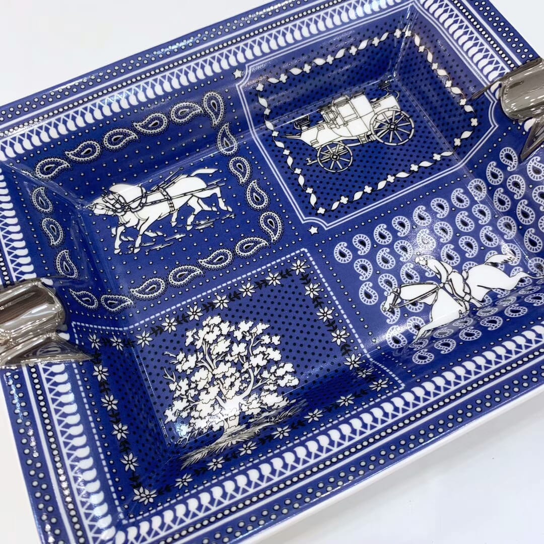 Пепельница Hermes LUX-24862 представляет собой элегантное керамическое изделие, выполненное в традиционном стиле бренда Hermes. Она украшена характерными мотивами, включающими изображения лошадей с повозкой, дерева и узоров пейсли, выполненных в контрастных бело-синих тонах. Такая пепельница станет изысканным дополнением интерьера, подчеркивающим утонченный вкус владельца.