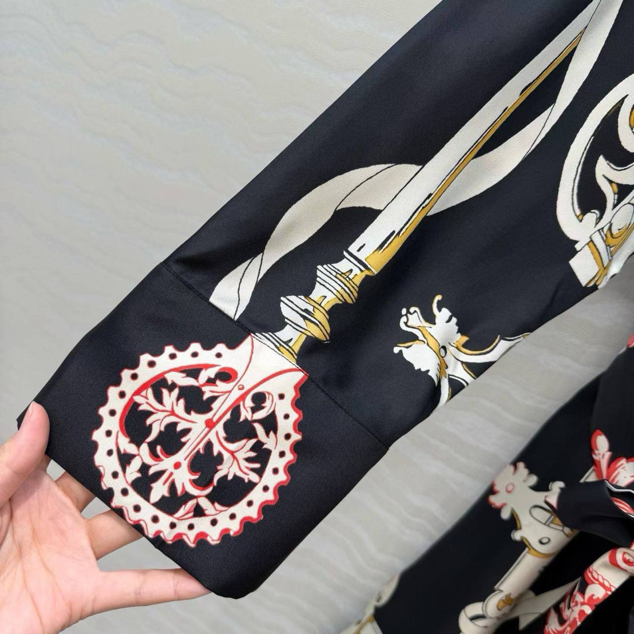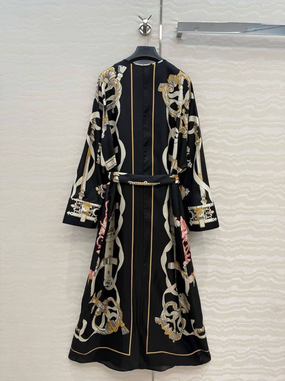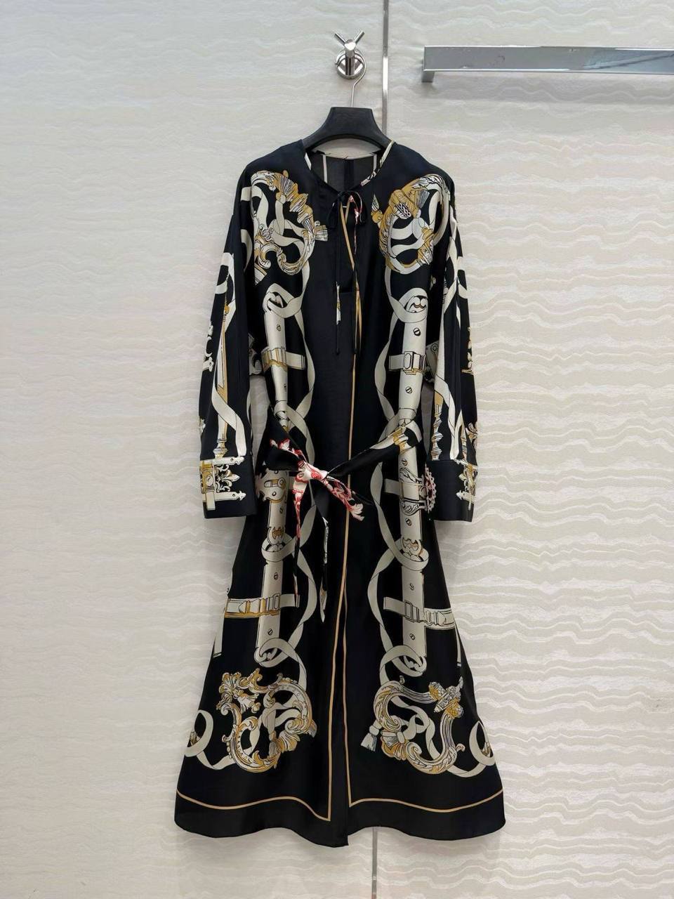Платье Hermes LUX-130230 миди длины, приталенное поясом. Модель с длинными рукавами и принтом в виде ремней и элементов геральдики.
