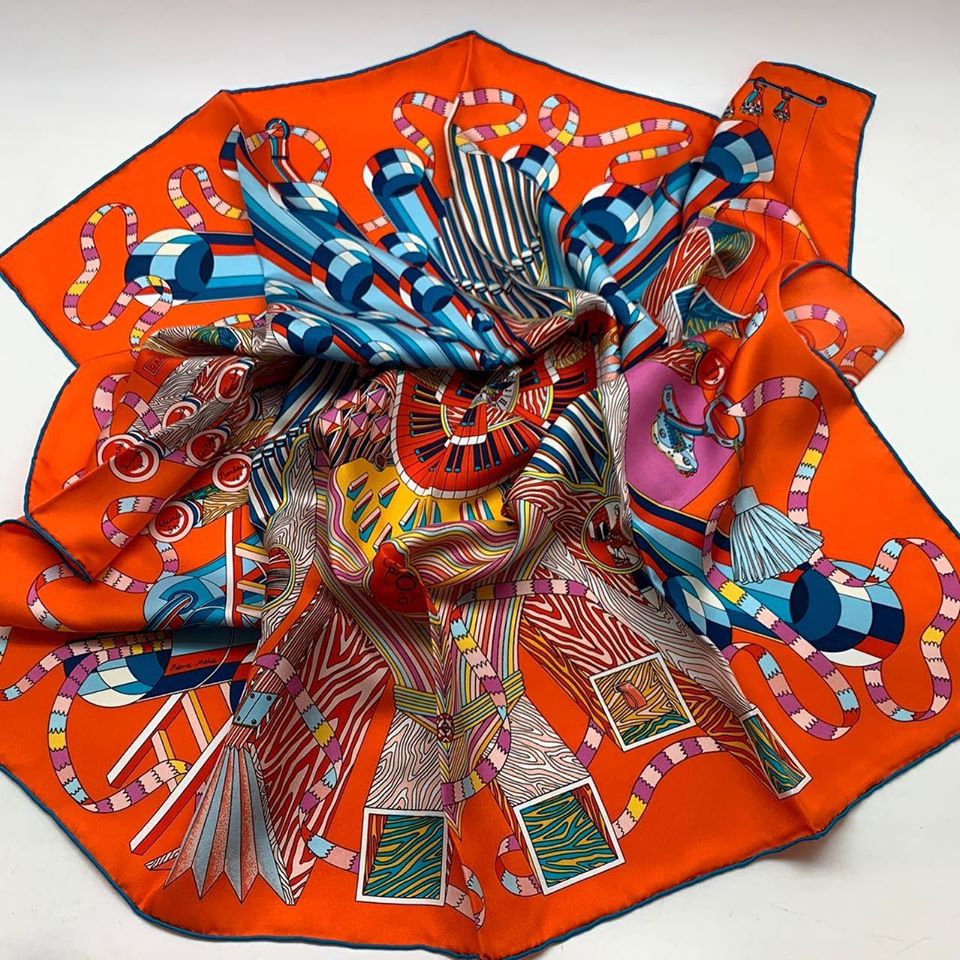 Платок Hermes LUX-30191 представляет собой яркое и стильное дополнение к вашему образу. Этот шелковый платок от Hermes отличается уникальным принтом, выполненным в насыщенных оранжевых, синих, розовых и желтых тонах. Узор включает в себя абстрактные формы, напоминающие музыкальные инструменты и геометрические фигуры, что придает платку современный и изысканный вид.
