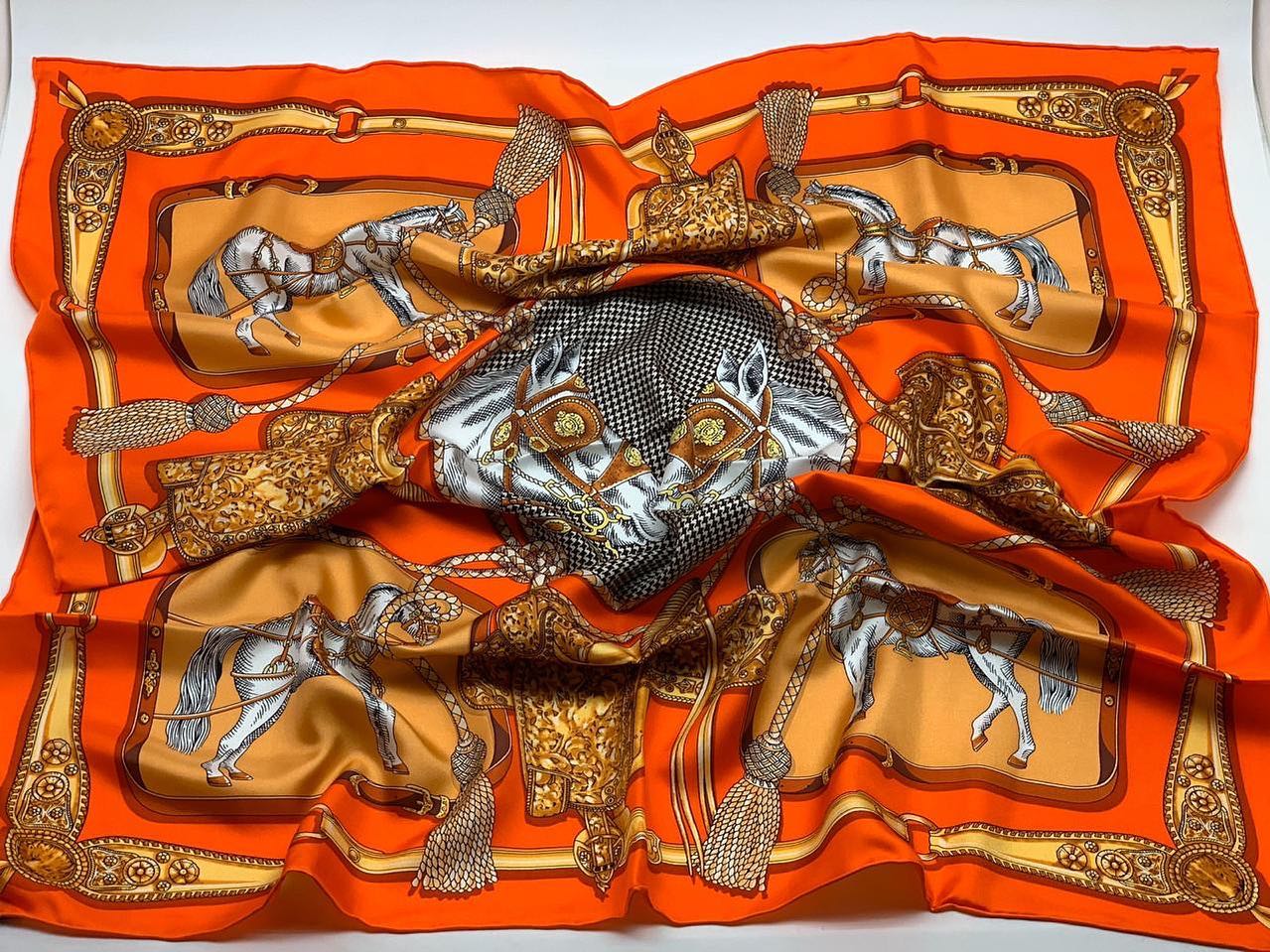 Этот роскошный платок Hermes LUX-30192 представляет собой настоящее произведение искусства, выполненное в насыщенных оранжевых тонах. Дизайн украшен изящными изображениями лошадей в богато украшенной упряжи, а также узорами в виде цепочек и кистей, что придает ему классический и элегантный вид. Платок Hermes LUX-30192 — это универсальный аксессуар, который добавит изысканности любому образу.