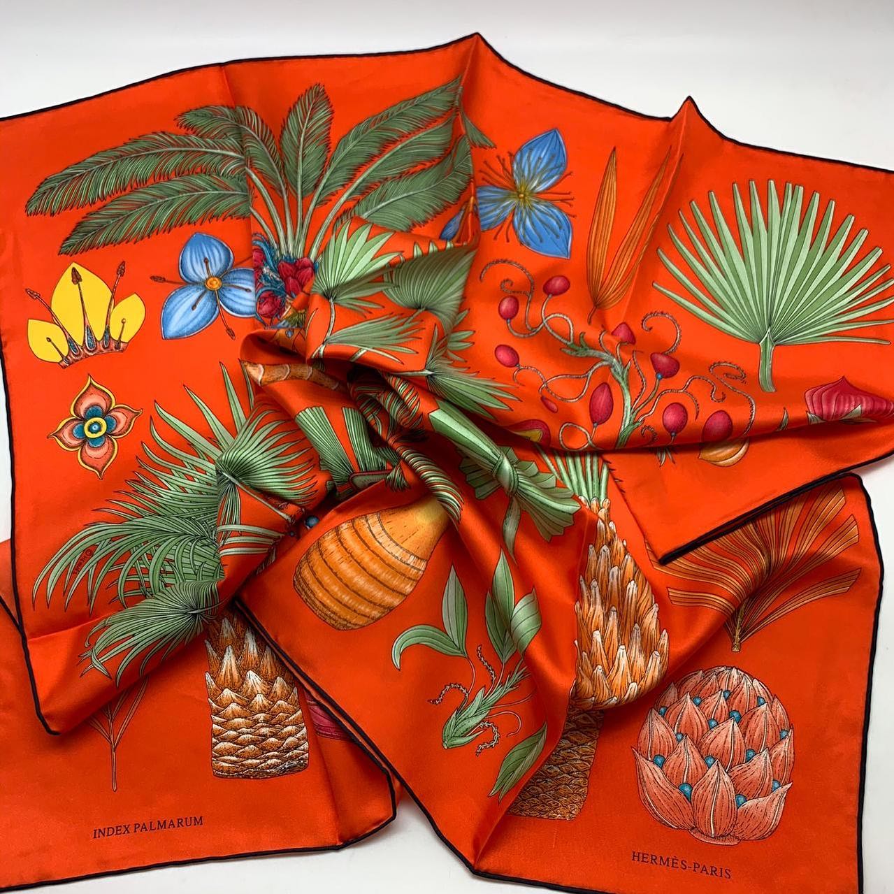 Шелковый платок Hermes LUX-36566 – это яркий и элегантный аксессуар, выполненный в стиле классической роскоши. Насыщенный оранжевый фон платка украшен детализированным ботаническим принтом с изображением экзотических растений, пальмовых листьев, цветов и тропических плодов. Этот предмет гардероба является воплощением изысканности и утонченности.