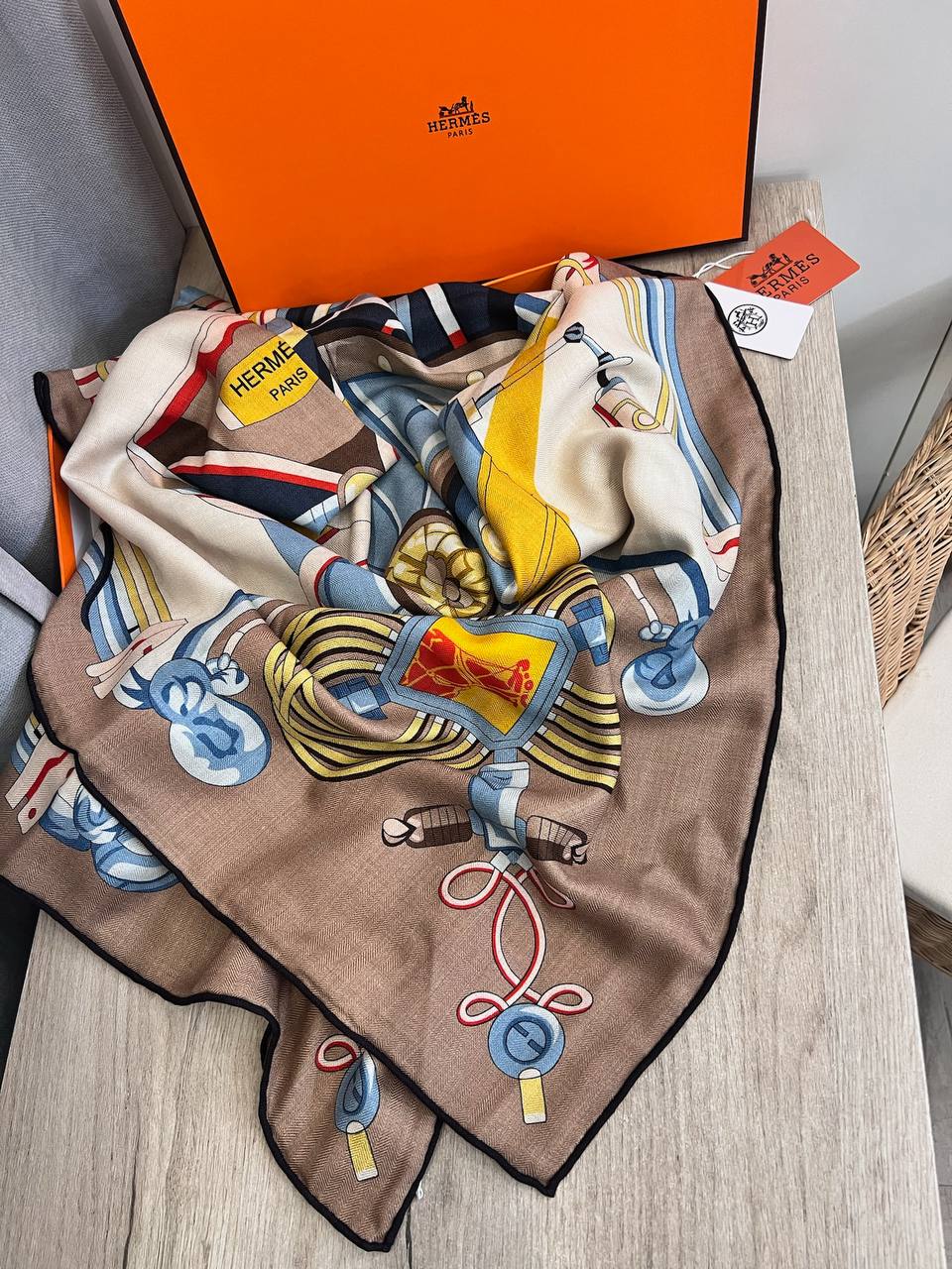 Платок 140*140 Hermes LUX-108486 — это изысканный аксессуар, который подчеркнет ваш стиль. Шелковый платок с уникальным узором в коричневых, желтых, синих и белых тонах. Он станет прекрасным дополнением к любому образу, добавляя нотку элегантности и роскоши.