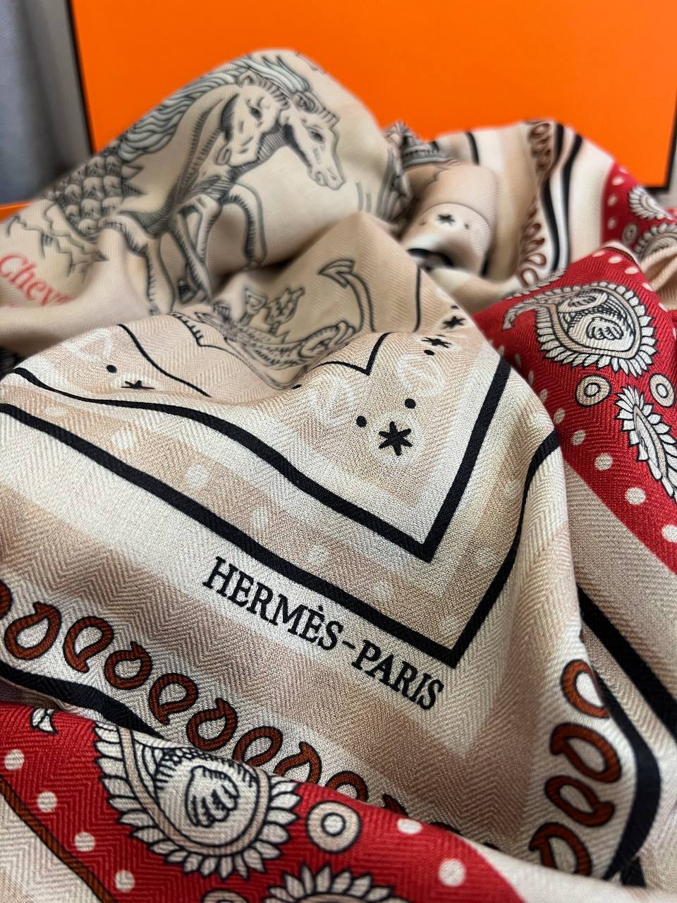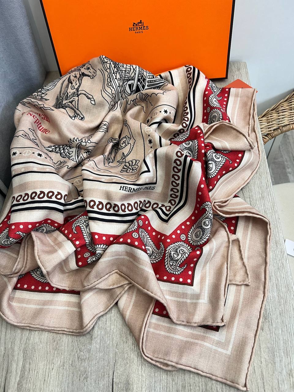 Платок 140*140 Hermes LUX-108492 — это элегантный аксессуар, выполненный в фирменном стиле Hermes. Платок представляет собой сочетание кремовых, бежевых и красных оттенков, украшенный сложным узором с изображением мифологических сюжетов. Может использоваться как шарф на шею, платок на голову или как стильный элемент декора.