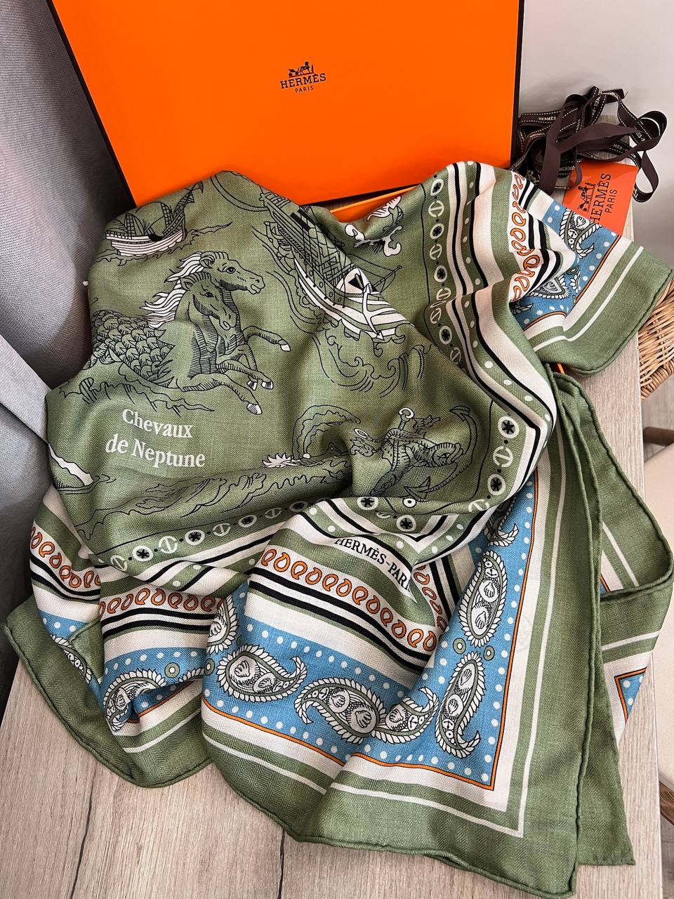 Платок 140*140 Hermes LUX-108499 - это элегантный аксессуар от известного бренда, сочетающий в себе изысканный дизайн и высокое качество исполнения. Платок выполнен в основном в зеленом цвете с уникальным рисунком. Он идеально подходит для добавления шарма в любой образ.