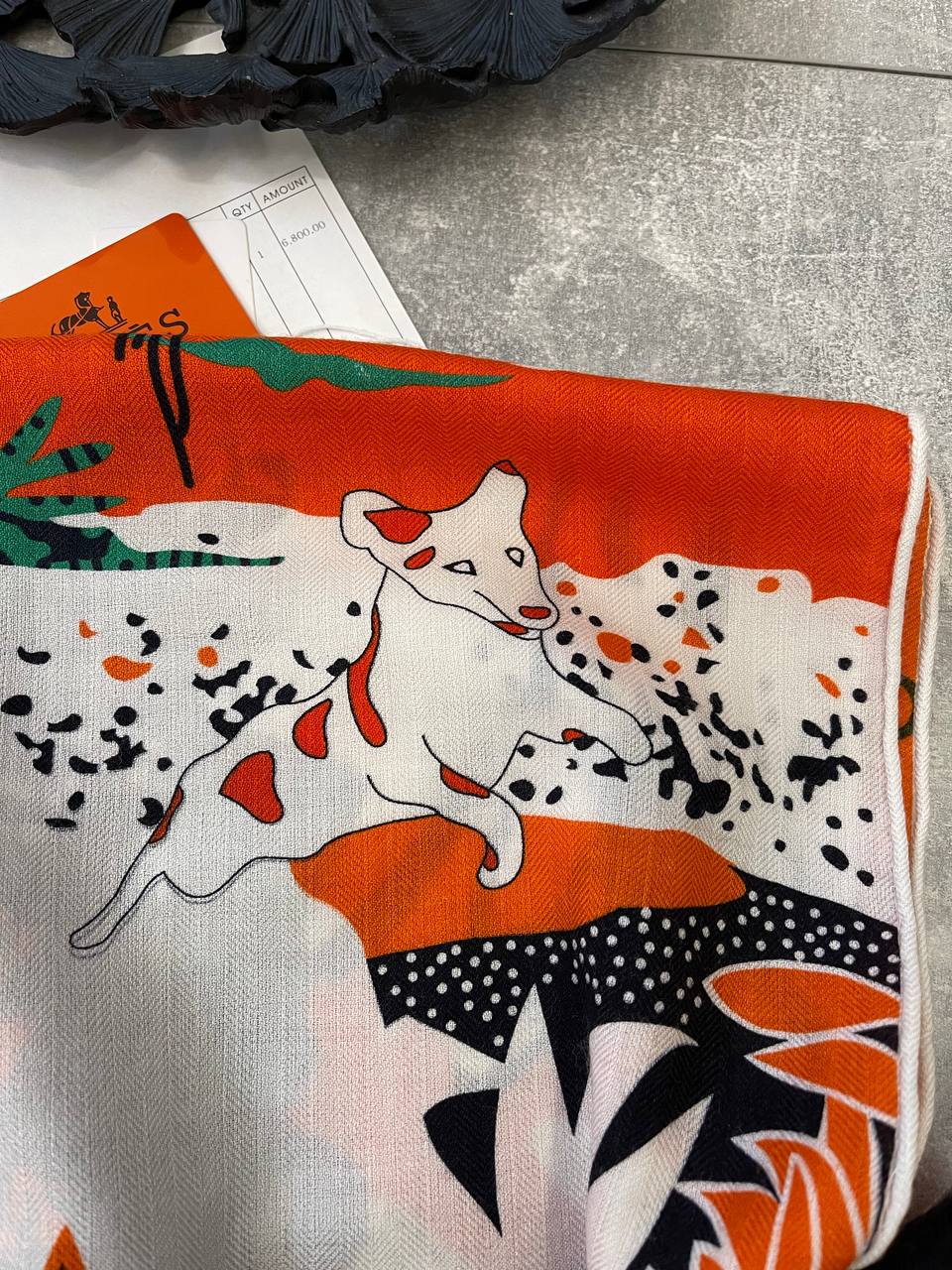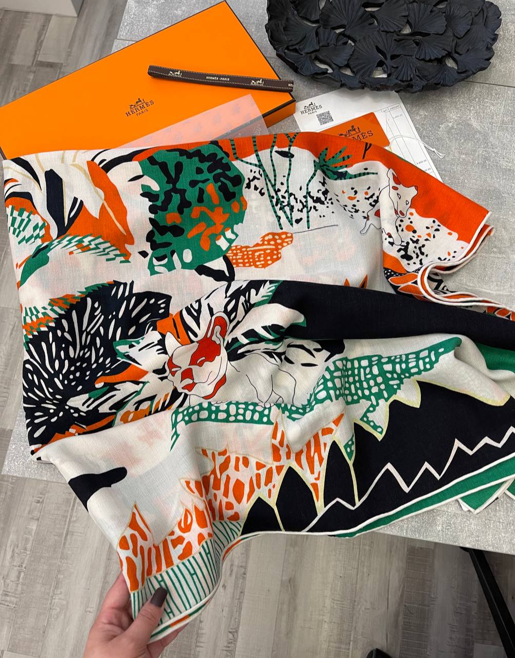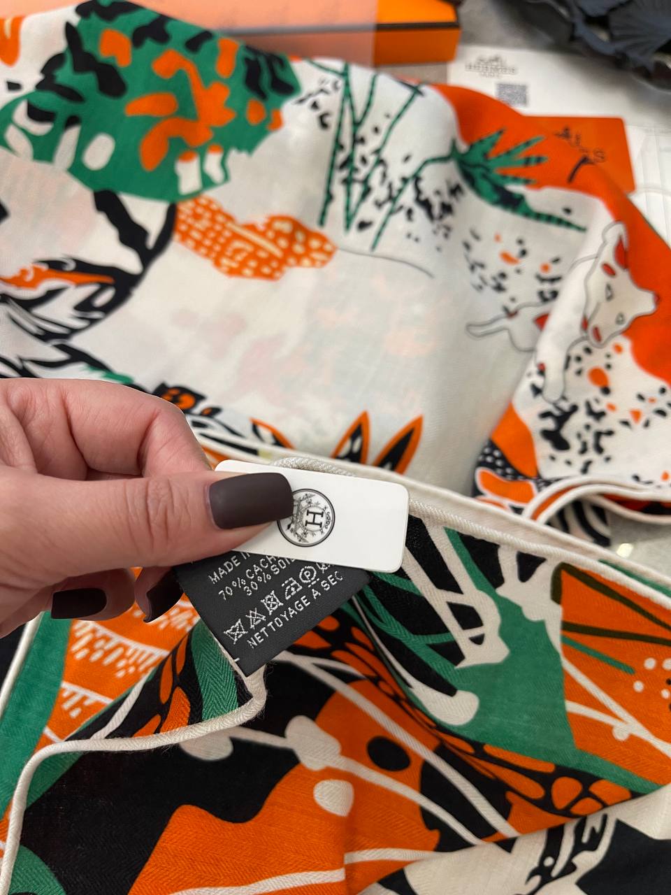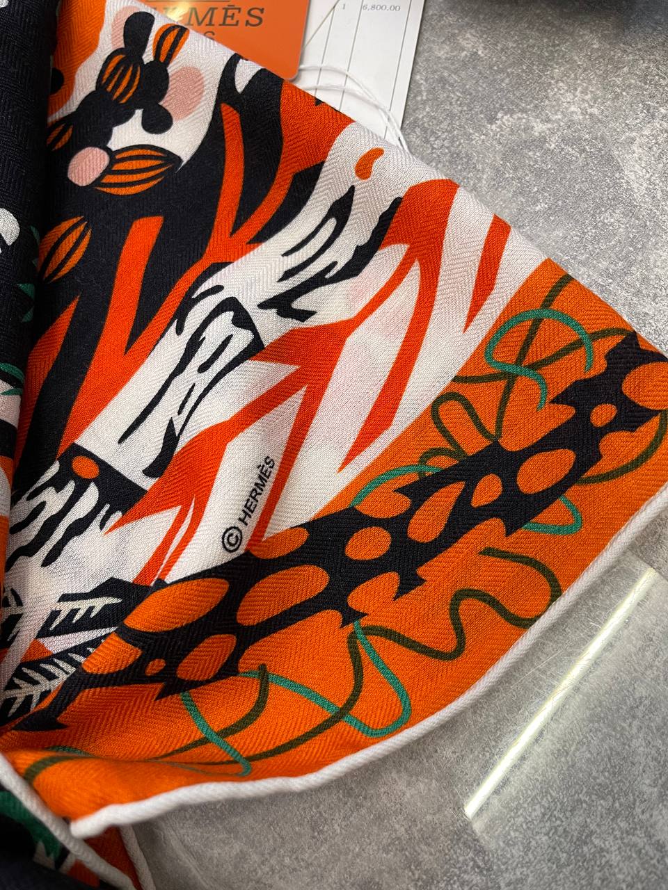 Платок 140*140 Hermes LUX-97109 — это элегантный аксессуар от известного бренда. Платок выполнен в яркой цветовой гамме с преобладанием оранжевого, зеленого, черного и белого цветов, украшен графическим принтом с растительными и анималистическими мотивами. Этот платок станет изысканным дополнением к любому образу.