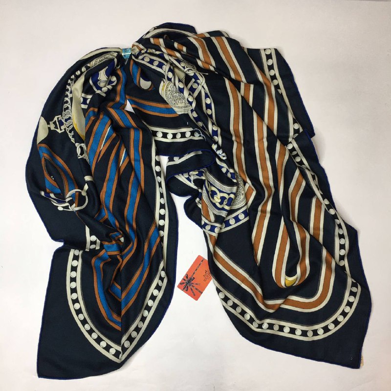 Шелковый платок Hermes LUX-55930 – это изысканный аксессуар, отличающийся классическим дизайном и высоким качеством. Его уникальный принт с элементами упряжи и полосами в темно-синих, синих и коричневых тонах делает его стильным дополнением к любому образу. Этот платок идеально подойдет для создания элегантных и утонченных ансамблей.
