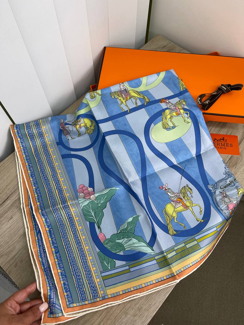 Платок Hermes LUX-73730 – это элегантный аксессуар, выполненный в фирменном стиле Hermes. Платок имеет синий цвет с красочными принтами, изображающими лошадей и жокеев, и подойдет для создания утонченных образов. Его можно носить на шее, голове или использовать как стильный акцент в образе.