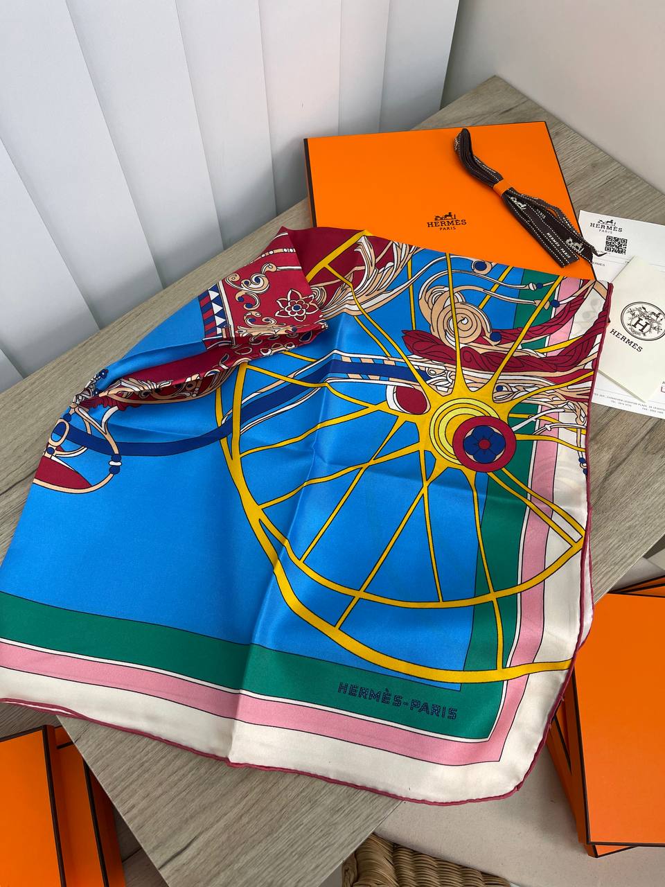 Платок Hermes LUX-64775 представляет собой изысканный шелковый аксессуар от бренда Hermes. Яркий и детализированный принт с изображением солнечного колеса на насыщенном синем фоне, дополненный бордовыми, желтыми и зелеными элементами, придает платку неповторимый стиль. Надпись "HERM?S-PARIS" подтверждает подлинность изделия. Этот платок — воплощение элегантности и роскоши.