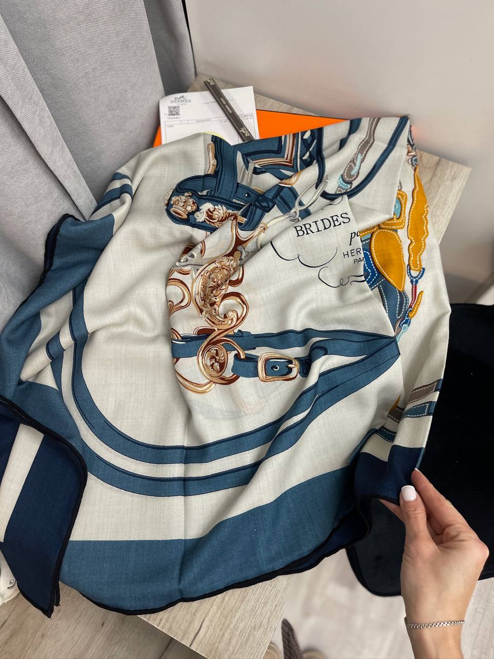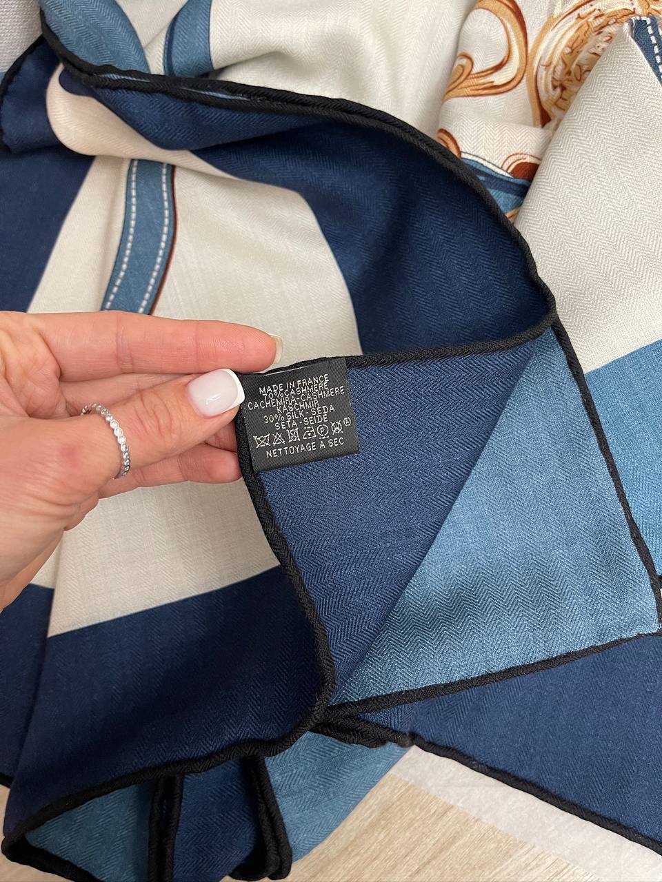 Платок Hermes LUX-99632 представляет собой элегантный аксессуар, выполненный в классическом стиле. Основной фон платка — светлый, с нанесенным узором, включающим элементы конной тематики и орнамента. Цветовая палитра включает синие, коричневые и золотистые оттенки. Платок можно использовать как шейный платок, головной убор или аксессуар для сумки.