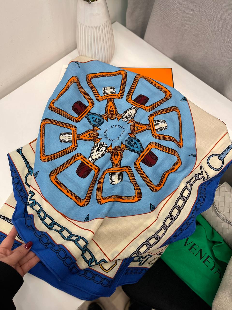 Платок Hermes LUX-114543 – это изысканный аксессуар, который добавит элегантности любому образу. Платок выполнен в яркой цветовой гамме с изображением цепей и других декоративных элементов. Этот платок прекрасно подойдет для создания стильных образов, как для повседневной носки, так и для особых случаев.