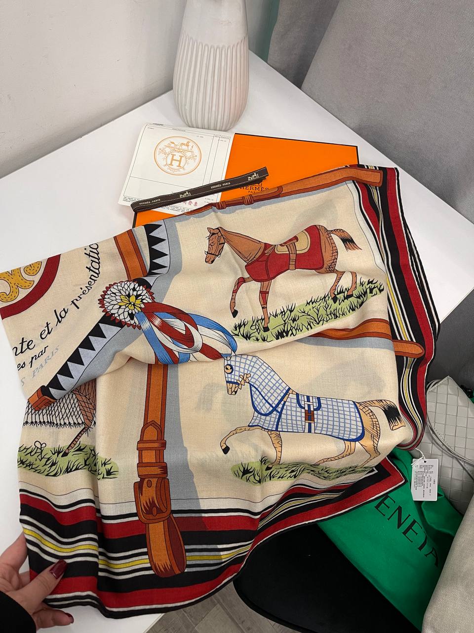 Платок Hermes LUX-114544 — это стильный аксессуар, выполненный в классическом стиле. Платок кремового оттенка украшен изображением лошадей и сложными узорами в сочетании с окантовкой насыщенных цветов. Этот платок станет изысканным дополнением к вашему образу, подчеркивая элегантность и индивидуальность.