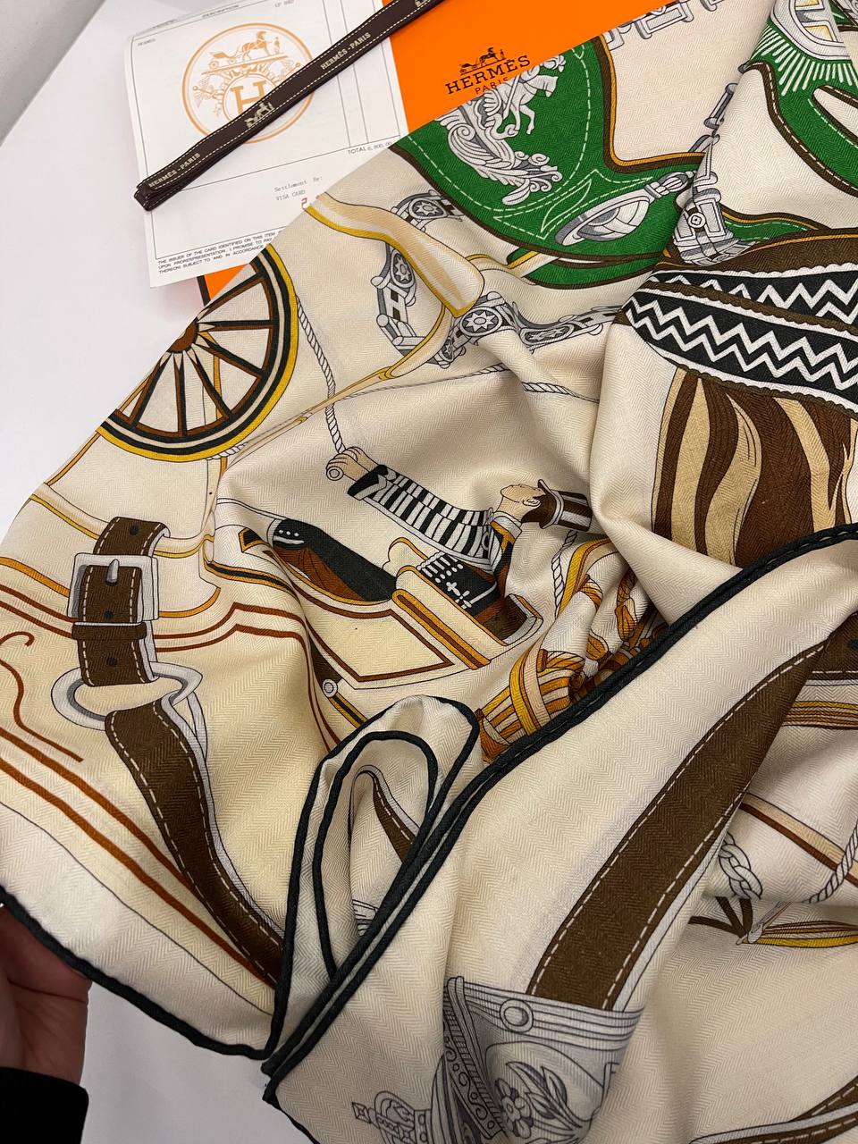 Платок Hermes LUX-114547 – это элегантный аксессуар, выполненный в классическом стиле. Основной цвет платка – кремовый, дополненный коричневыми, зелеными и белыми деталями. На платке изображен сложный узор с элементами карет, колес и других исторических символов. Платок станет прекрасным дополнением к вашему образу.