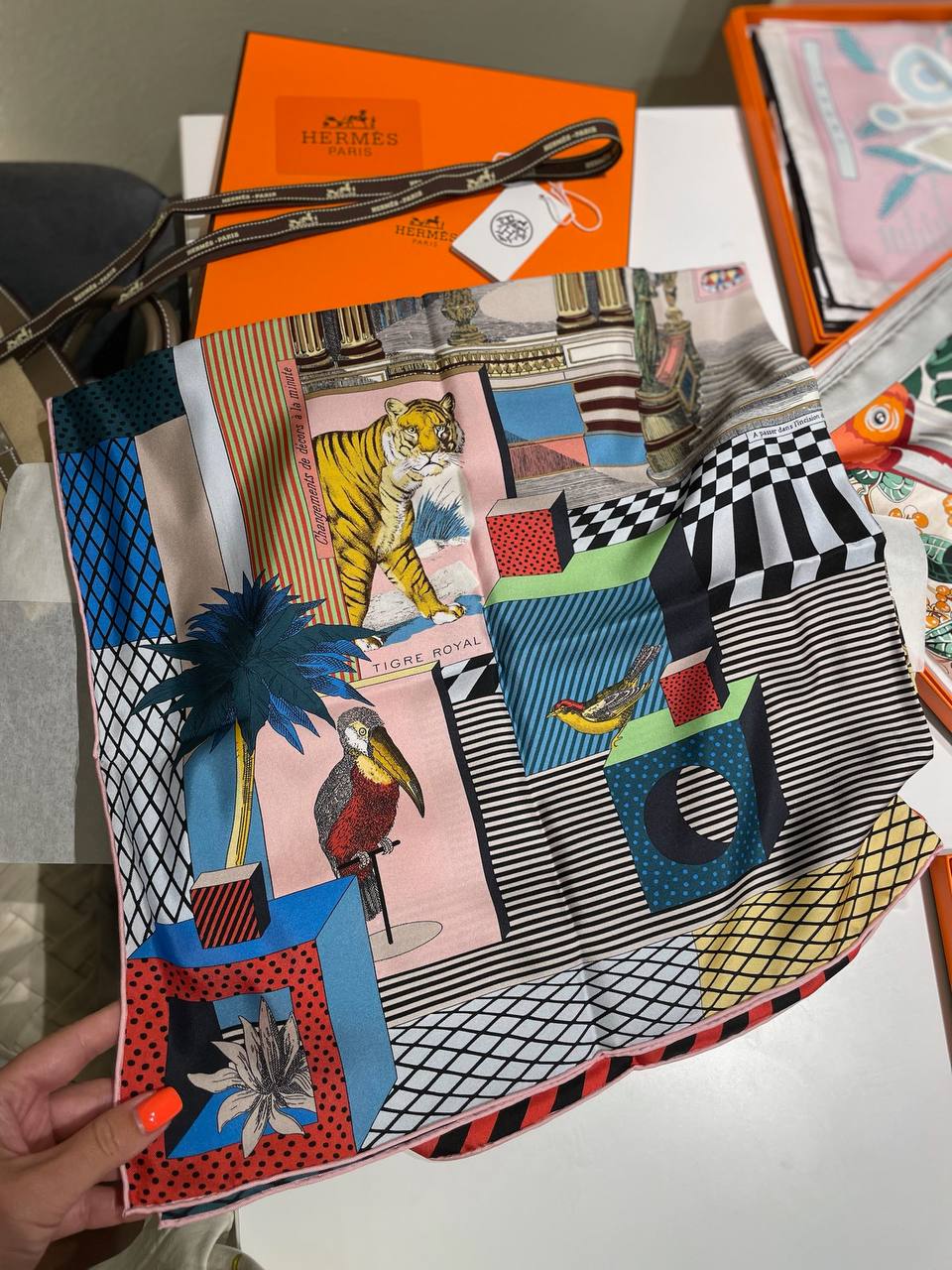 Вот описание платка Hermes LUX-122343: Элегантный платок Hermes LUX-122343 – стильный аксессуар, который добавит изысканности в любой образ. Он отличается ярким и оригинальным дизайном с изображением тигра и птиц, выполненным в стиле поп-арт.