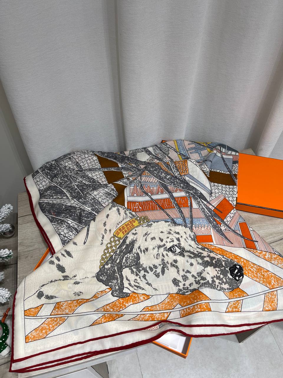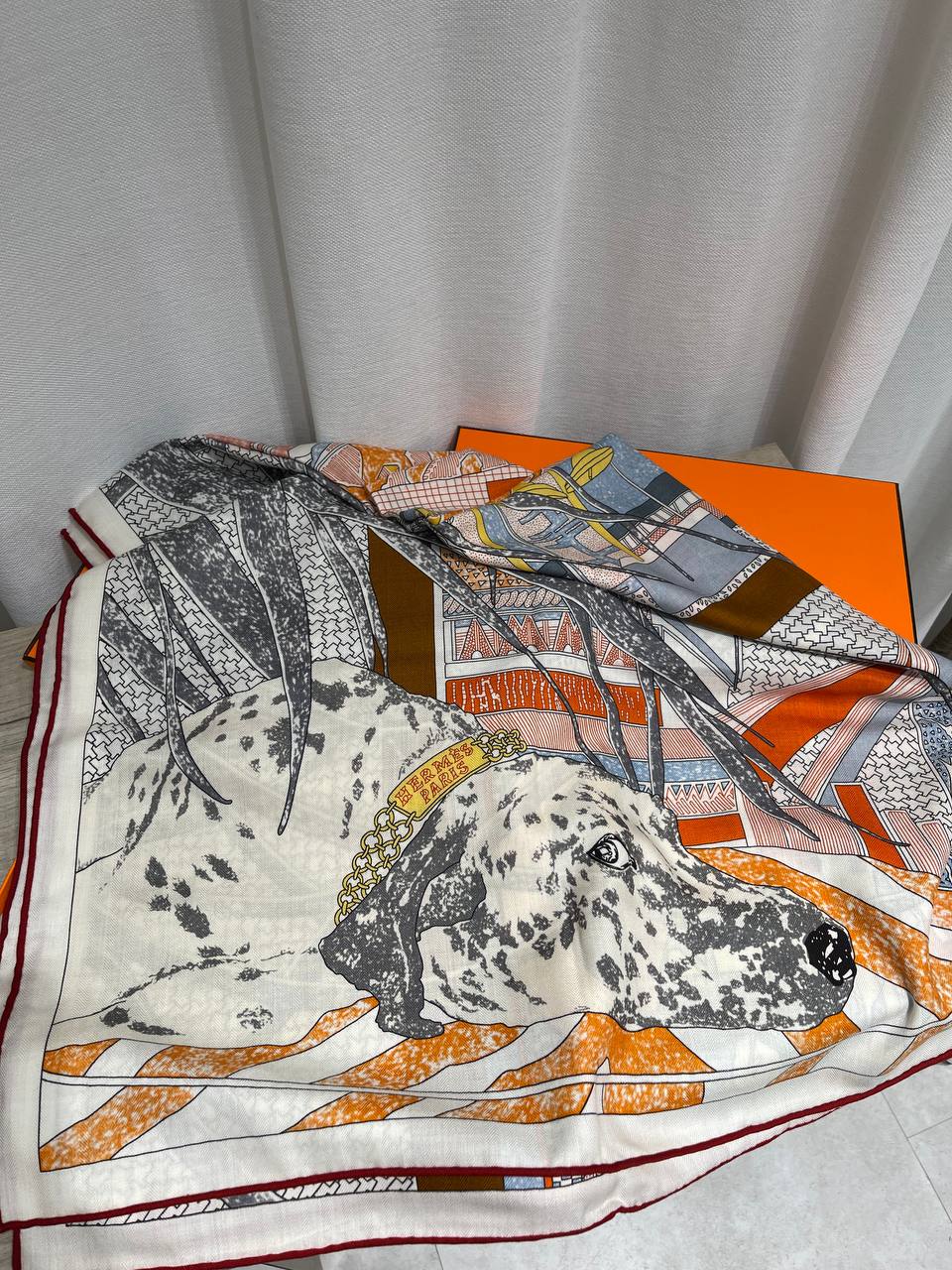 Платок Hermes – это изысканный аксессуар, сочетающий в себе элегантность и утонченный стиль. Данный платок станет ярким акцентом в вашем образе, подчеркивая индивидуальность и хороший вкус. Изысканный дизайн с изображением собаки и геометрическими мотивами.