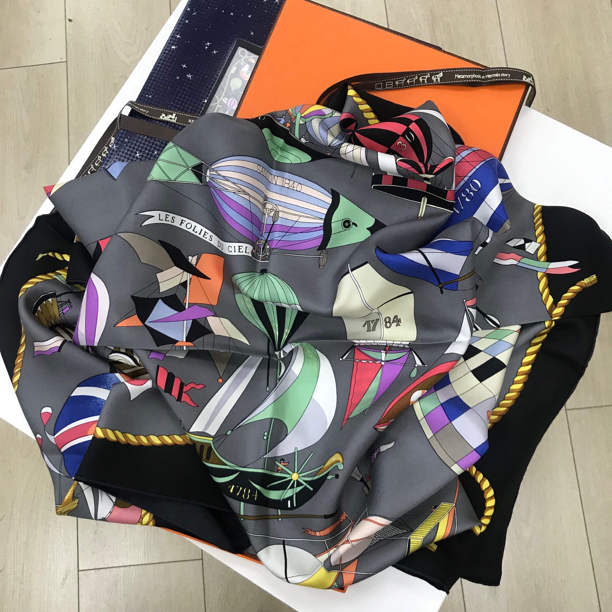Платок Hermes LUX-27186 – это элегантный аксессуар, который добавит изысканности любому образу. Его яркий и оригинальный дизайн с изображением воздушных шаров и парусников, а также надписью "LES FOLIES DU CIEL" создает ощущение легкости и приключения. Этот платок станет прекрасным дополнением как к деловому, так и к повседневному стилю, подчеркивая вашу индивидуальность.