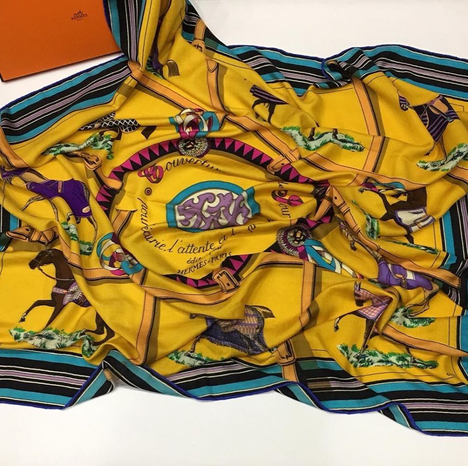 Этот шелковый платок Hermes LUX-28763 — яркий аксессуар, который добавит изысканности любому образу. Дизайн платка представляет собой конную тематику с элементами упряжи и лошадьми в движении, выполненный на ярко-желтом фоне. Края платка украшены полосами черного, синего и фиолетового цветов. Этот платок станет элегантным дополнением к вашему гардеробу, подчеркивая ваш утонченный вкус.