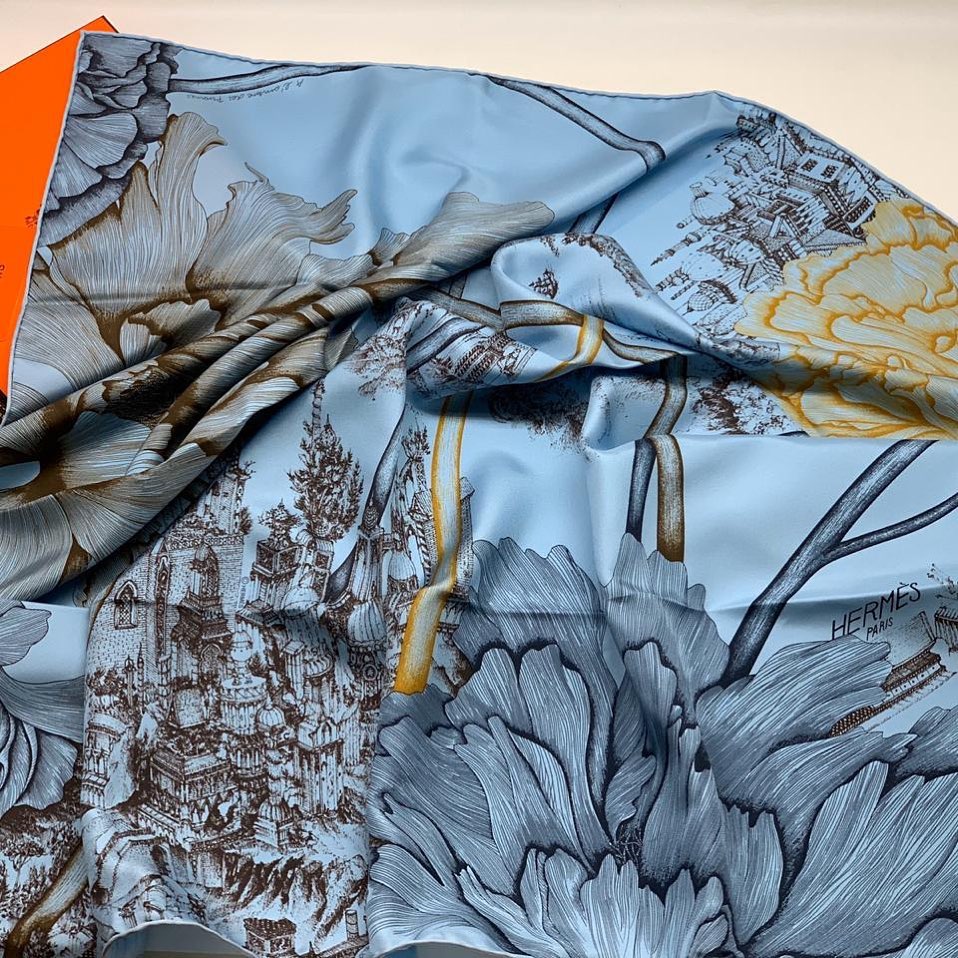Шелковый платок Hermes LUX-30156 представляет собой изысканный аксессуар с уникальным авторским дизайном, демонстрирующим художественное видение бренда. Светло-голубой фон украшен детализированными принтами, сочетающими изображения экзотических цветов и архитектурных элементов, создавая атмосферу мечтательности и утонченности. Этот платок станет элегантным дополнением к любому образу.