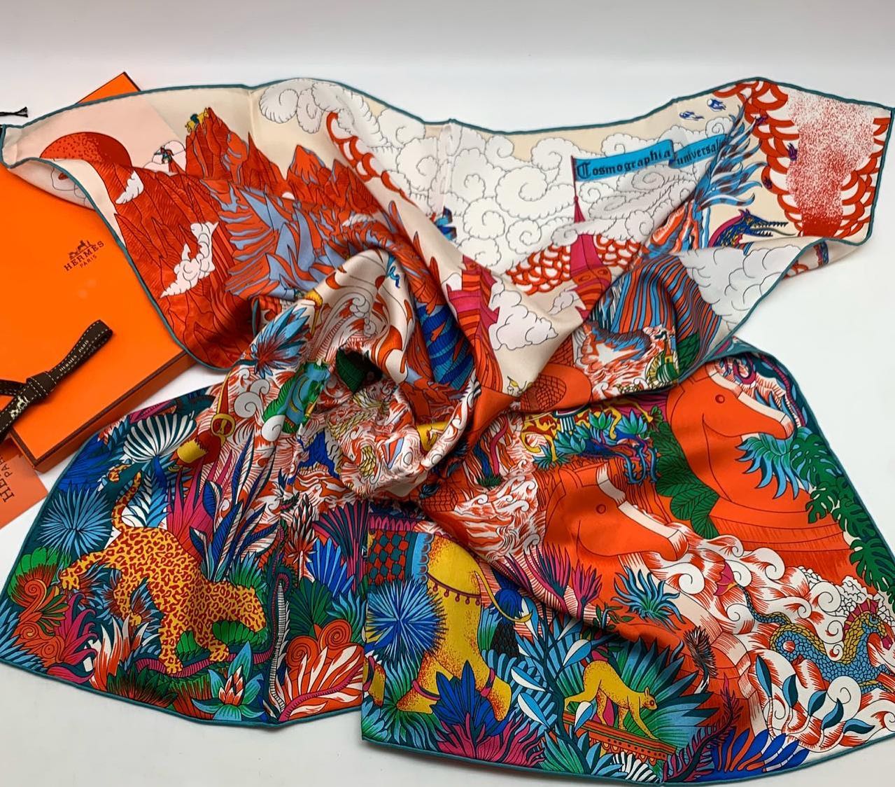 Платок Hermes LUX-30160 — это изысканный аксессуар, выполненный в ярком, детализированном дизайне. Этот платок от Hermes, с его живописным узором, включающим экзотических животных и растительность, станет эффектным дополнением к вашему образу.