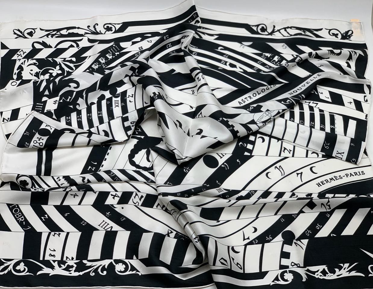 Платок Hermes LUX-30164 представляет собой элегантный аксессуар, выполненный в черно-белой цветовой гамме с оригинальным принтом, напоминающим астрологическую карту и нотную запись. Этот платок от Hermes добавит изысканности любому образу, подчеркивая ваш утонченный вкус.