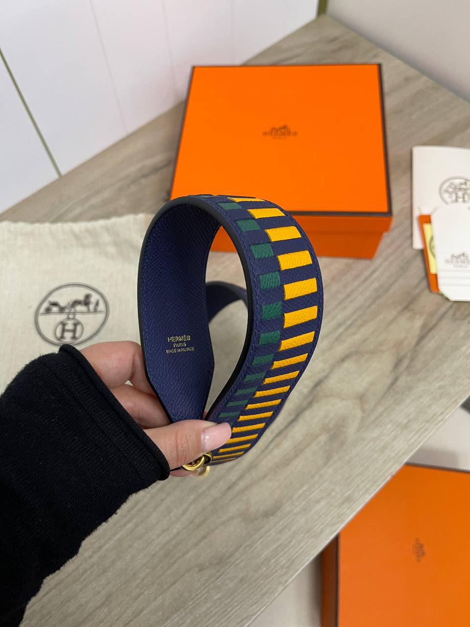 Плечевой ремень Hermes LUX-83665 – это стильный аксессуар, который добавит изысканности вашему образу. Ремень выполнен в синем цвете с геометрическим узором из желтых и зеленых полос, придавая ему современный вид. Предназначен для использования с сумками и другими аксессуарами.