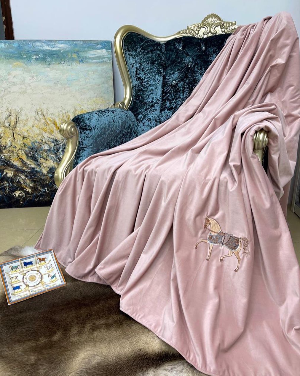 Элегантный плед Hermes LUX-48058 в нежно-розовом оттенке, украшенный изысканной вышивкой в виде лошади. Этот плед в стиле классика и роскоши привнесет уют и утонченность в любое пространство. Идеально подходит для создания уютной атмосферы дома.