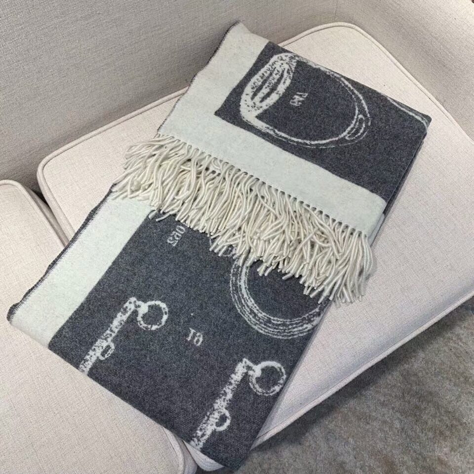 Плед Hermes LUX-22129 представляет собой роскошное текстильное изделие, выполненное в классическом стиле. На его поверхности отчетливо прослеживается узор, вдохновленный элементами конной сбруи и конской тематикой, что характерно для бренда Hermes. Белый фон пледа контрастирует с графичным черно-серым принтом, создавая изысканный и элегантный вид.