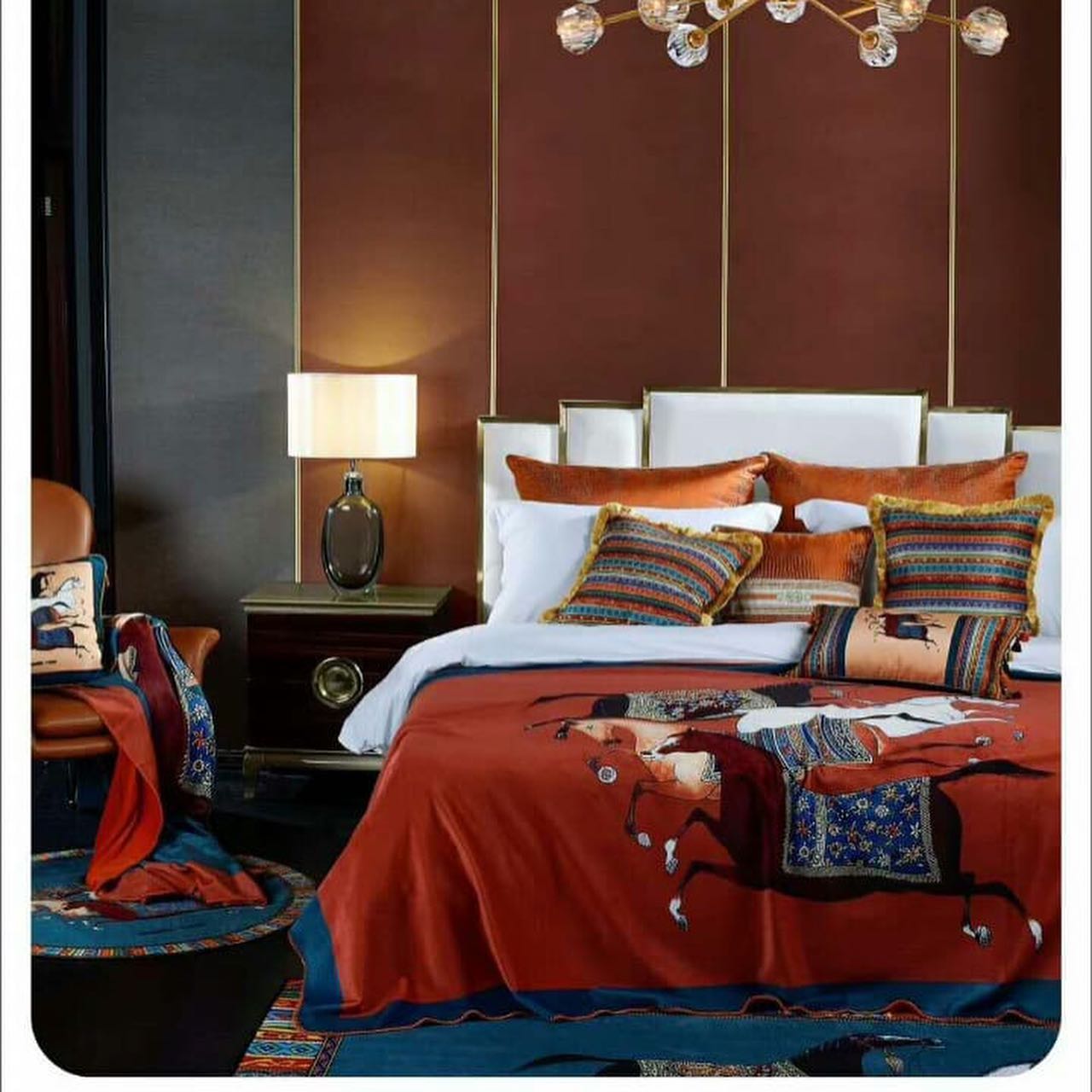 Плед Hermes LUX-33205 представляет собой роскошное текстильное изделие, выполненное в классическом стиле с ярким акцентом на изображение лошадей. Этот плед станет элегантным дополнением к интерьеру спальни или гостиной, добавляя нотку изысканности и тепла.