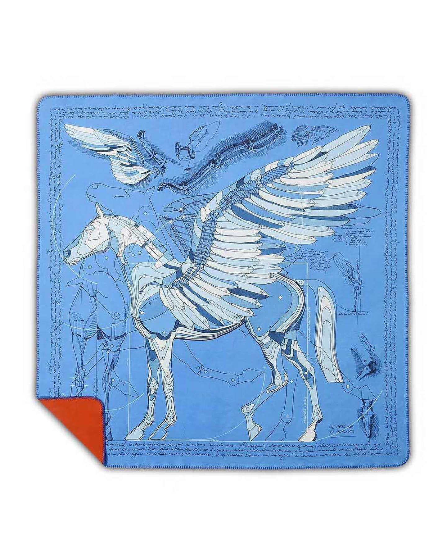 Плед Hermes LUX-35107 представляет собой изысканный предмет интерьера, выполненный в стиле, сочетающем классику и художественный дизайн. На синем фоне расположен детализированный принт в виде чертежа крылатой лошади, что придает ему уникальный и элегантный вид. Это идеальный выбор для ценителей роскоши и оригинальности.
