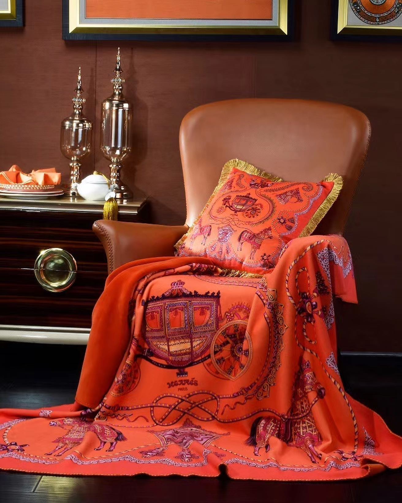 Плед Hermes LUX-35115 — это элегантный предмет домашнего текстиля, который добавит роскоши и стиля вашему интерьеру. Изделие выполнено в ярком оранжевом цвете с изысканным узором, включающим изображения карет и лошадей, характерных для стиля бренда. Этот плед станет идеальным дополнением к уютной гостиной или спальне, создавая атмосферу изысканности.