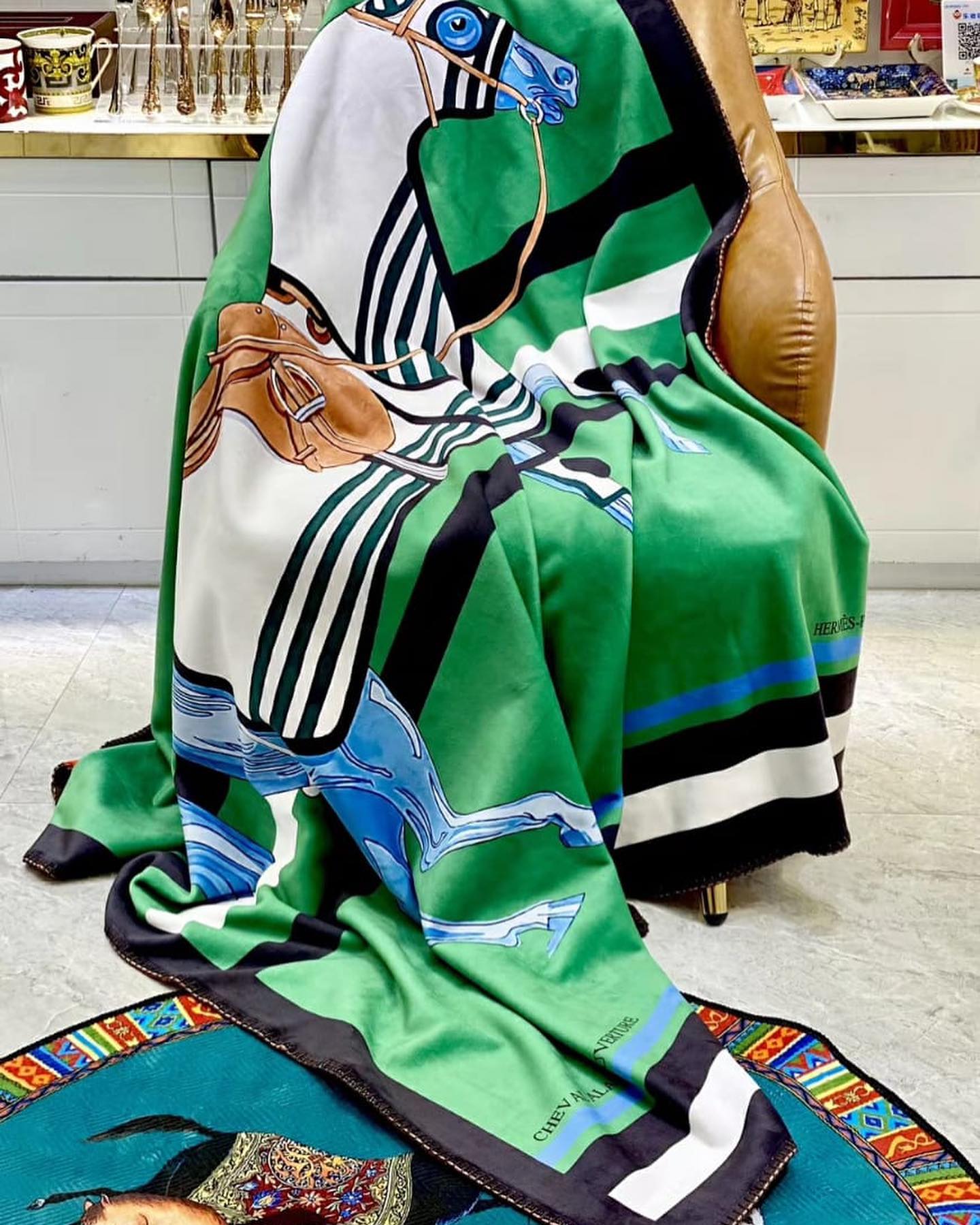 Этот плед Hermes LUX-35120 представляет собой стильный элемент декора, выполненный в ярком и динамичном дизайне с изображением лошадей и упряжи. Зеленый фон, дополненный контрастными полосами и детальными рисунками, создает ощущение роскоши и элегантности.