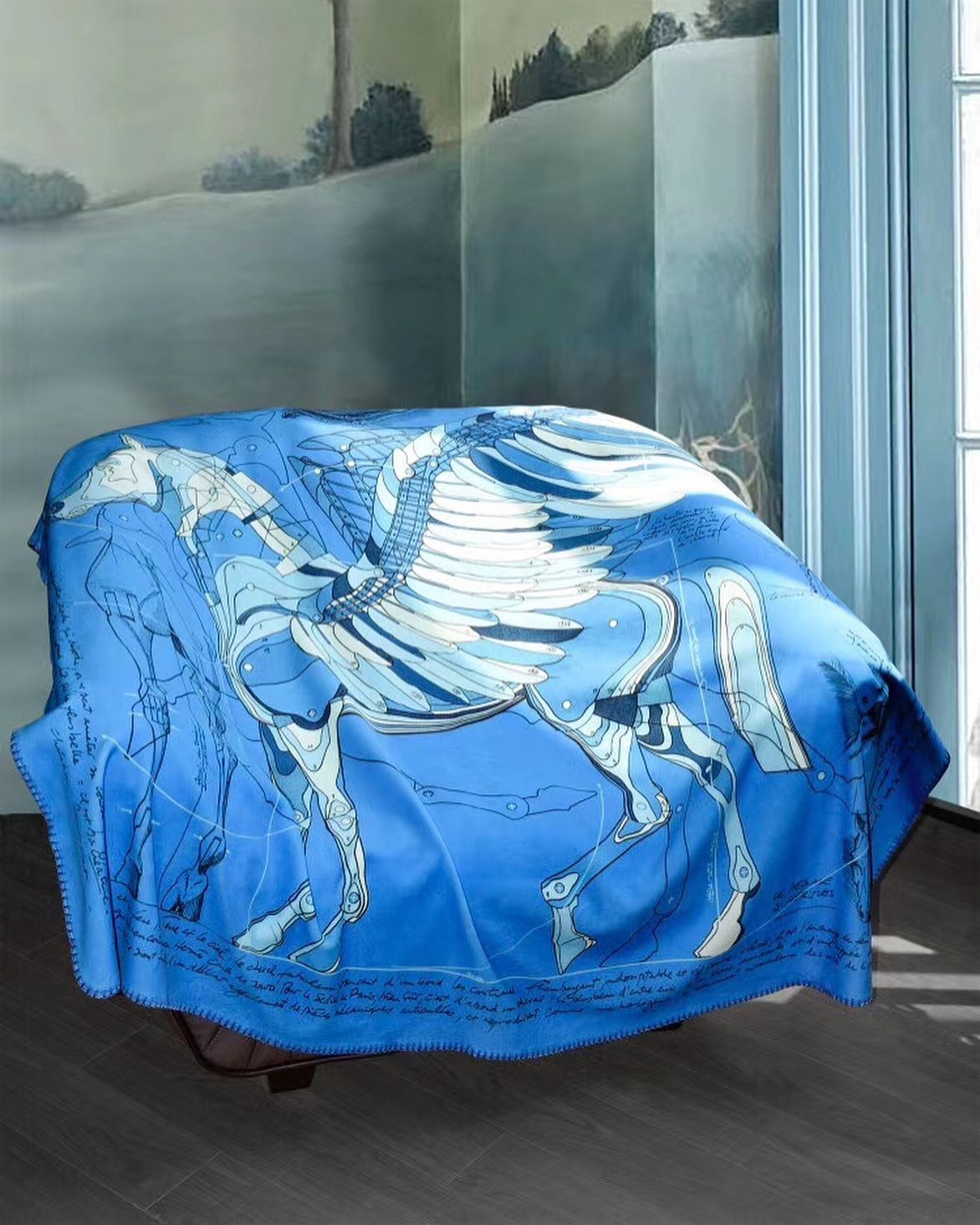 Плед Hermes LUX-35121 представляет собой роскошное текстильное изделие, выполненное в стиле, характерном для дома Hermes. Изделие украшено уникальным принтом с изображением мифического пегаса, выполненным в приглушенных синих и голубых тонах, что придает ему изысканный и художественный вид. По периметру пледа идет декоративная строчка, а также присутствует надпись рукописным шрифтом, добавляющая аутентичности.