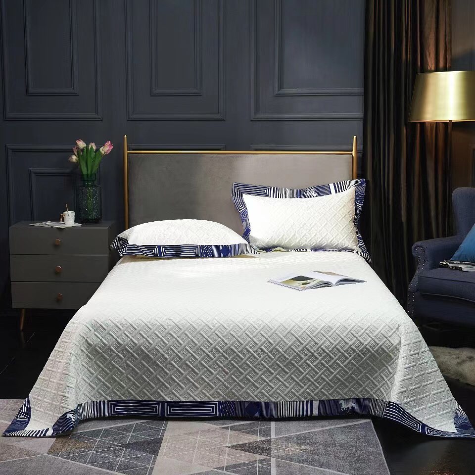 Элегантное покрывало Hermes LUX-39076 выполнено в современном стиле, идеально подходит для создания уютной и изысканной атмосферы в спальне. Его дизайн с геометрическим узором и контрастными синими элементами придает интерьеру особый шарм.