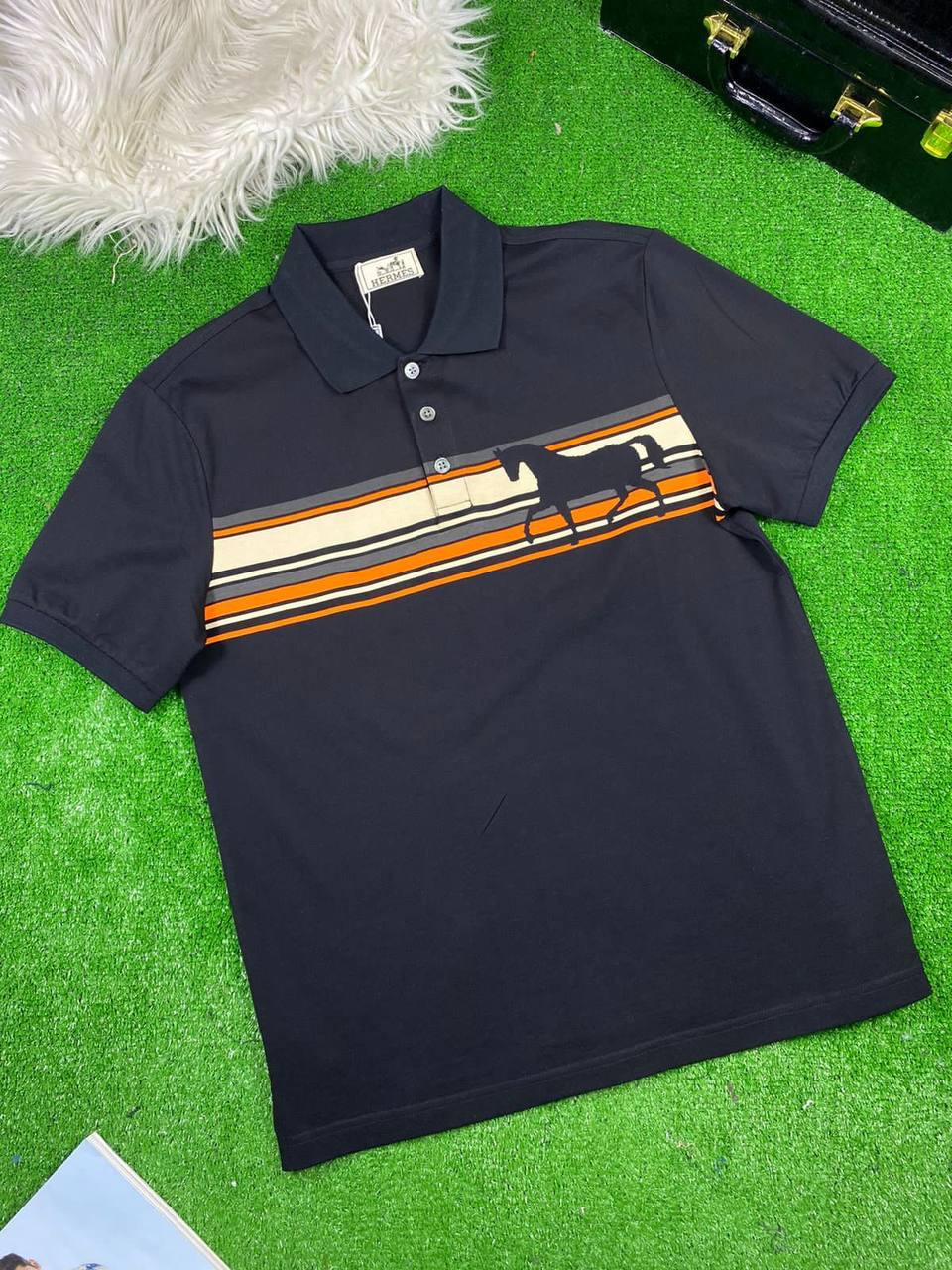 Это элегантное поло Hermes LUX-65920, выполненное в классическом стиле, станет отличным дополнением к вашему гардеробу. Темный цвет изделия выгодно подчеркивает контрастный узор с изображением лошади и полос, добавляя образу динамичности. Поло идеально подойдет для создания как повседневных, так и более формальных образов, обеспечивая комфорт и стиль.