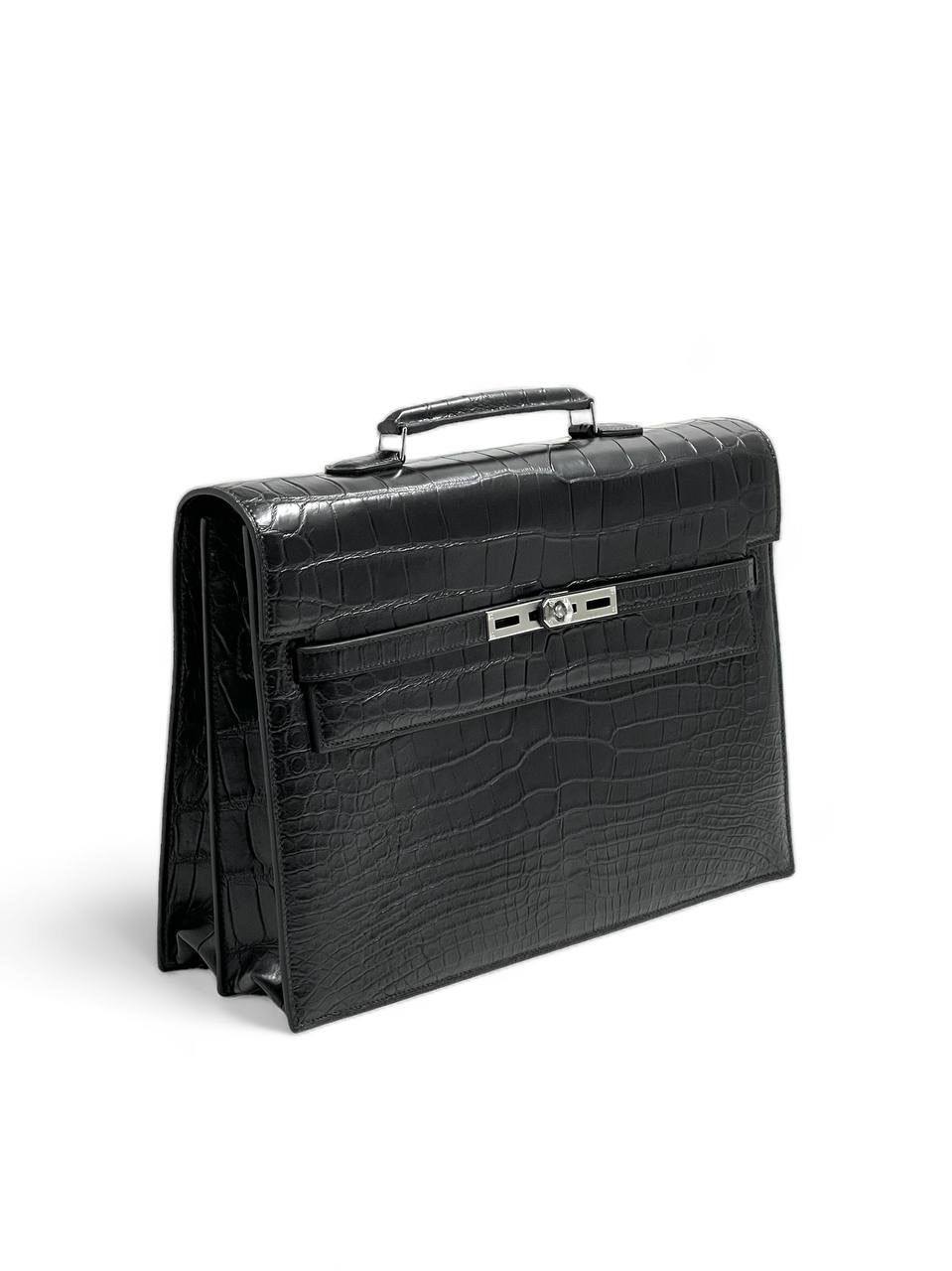Портфель из натуральной кожи крокодила Hermes LUX-92216 представляет собой элегантный аксессуар для деловых людей. Чёрный цвет и текстура кожи крокодила придают ему роскошный вид. Портфель предназначен для переноски документов и других необходимых вещей.