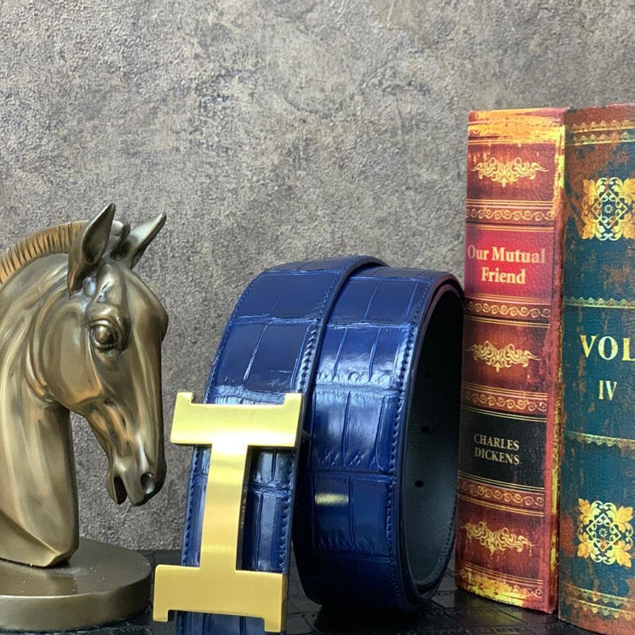 Мужской ремень Hermes LUX-31427 представляет собой изысканный аксессуар, выполненный в классическом стиле. Изделие привлекает внимание насыщенным синим цветом и тиснением под крокодилью кожу, что придает ему роскошный вид. Акцент в дизайне сделан на золотистую пряжку с узнаваемым логотипом бренда, добавляющую элегантности. Этот ремень станет идеальным дополнением к деловому или элегантному повседневному образу.