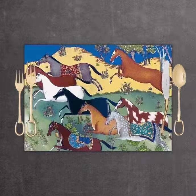 Hermes салфетка для стола LUX-58464 представляет собой уникальный аксессуар для сервировки стола, выполненный в стиле, вдохновленном восточными мотивами. На ярком изображении запечатлена динамичная сцена с бегущими лошадьми, что придает изделию особый шарм и элегантность. Это не просто функциональный предмет, но и настоящее произведение искусства, способное украсить любое застолье.