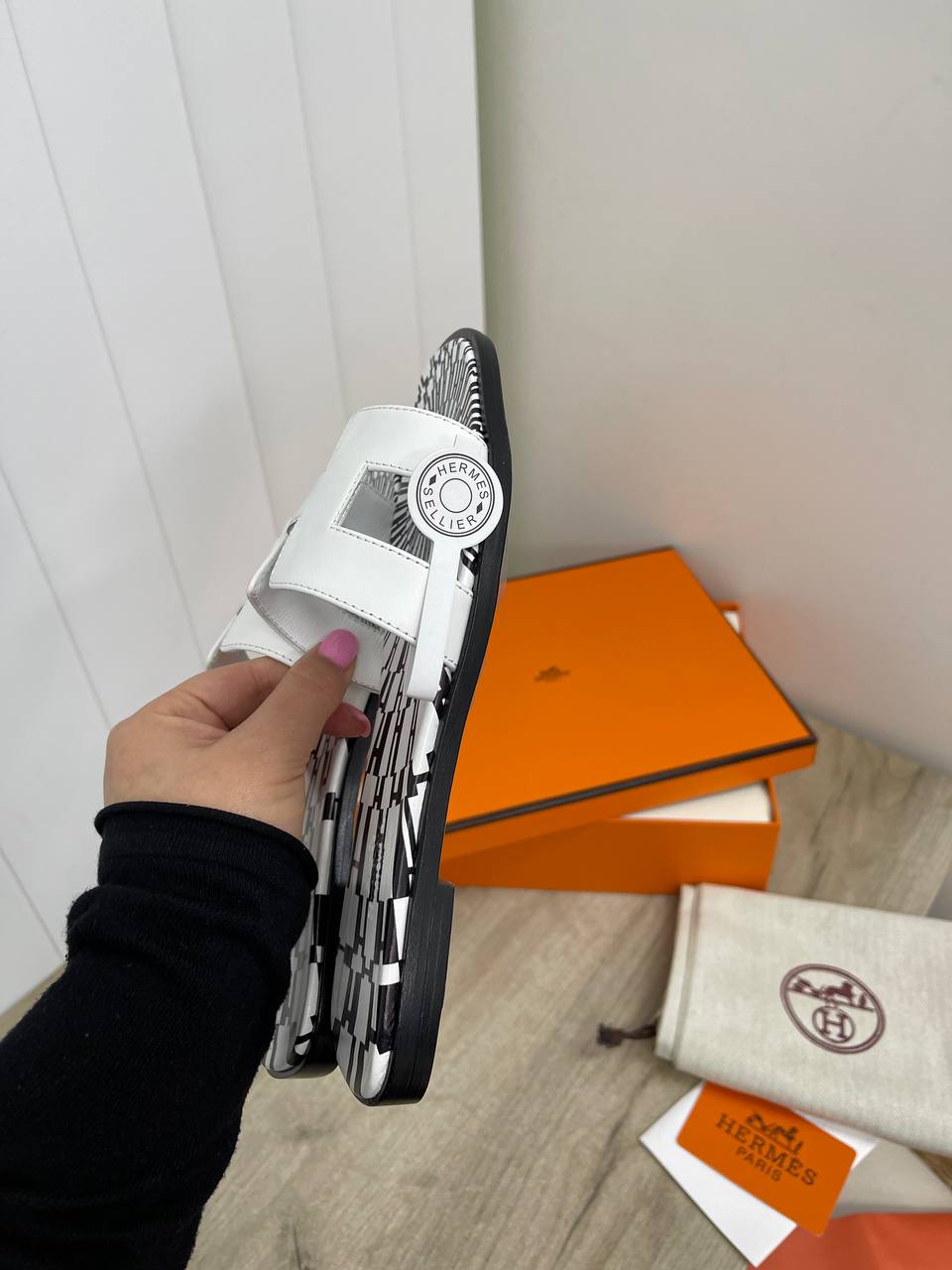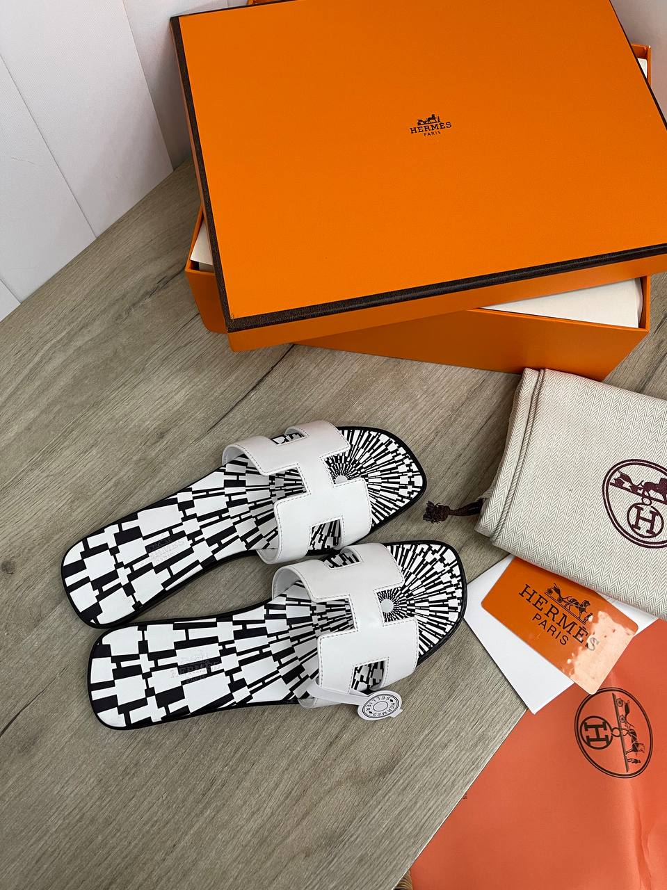 Сандалии Hermes LUX-85541 - это воплощение элегантности и комфорта. Модель выполнена в классическом стиле с характерным дизайном в виде буквы "H" на союзке. Белый цвет сандалий гармонично сочетается с черным узором на стельке, делая их идеальным выбором для летних образов.