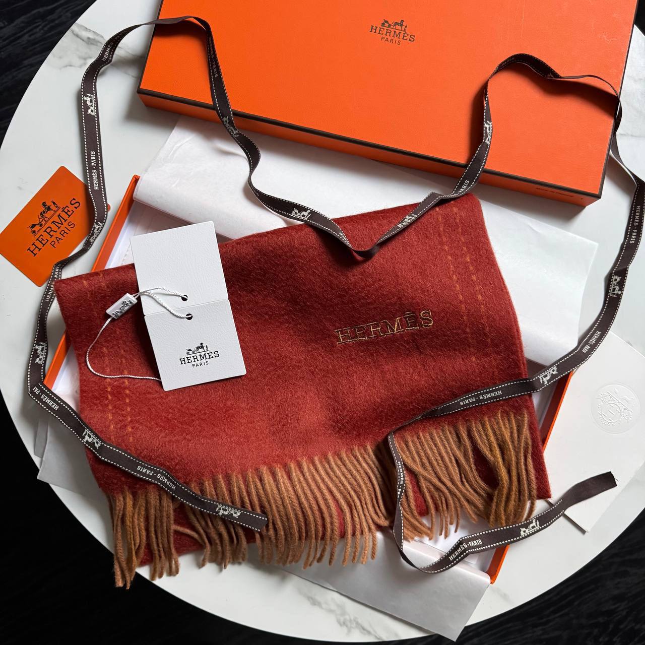 Шарф Hermes LUX-112770 - это изысканный аксессуар, который сочетает в себе элегантность и тепло. Шарф выполнен в красном оттенке с бахромой, придающей ему особый шарм. На шарфе вышито название бренда. Этот аксессуар станет отличным дополнением к любому образу.