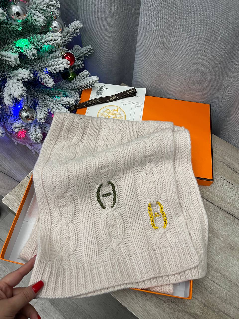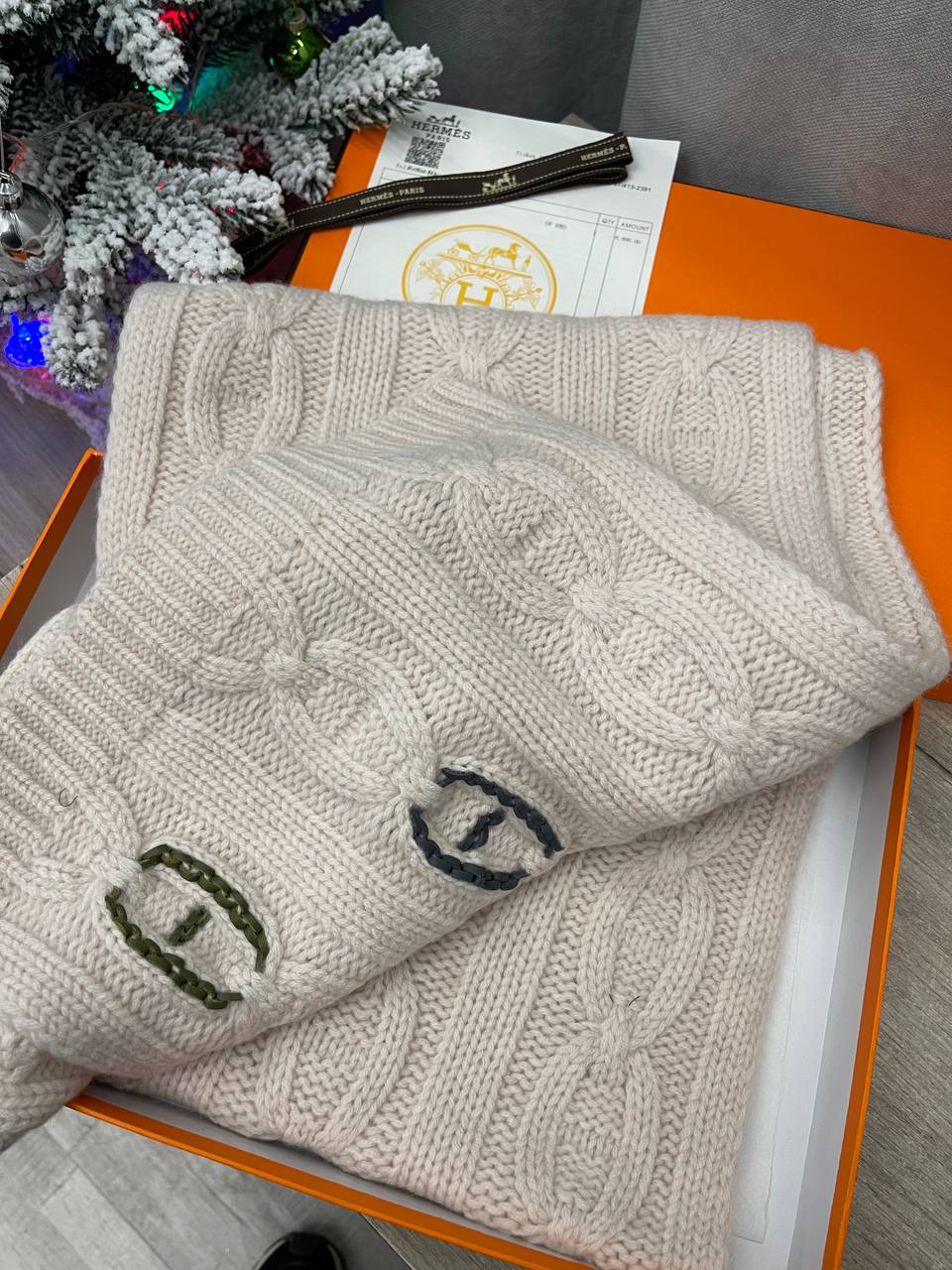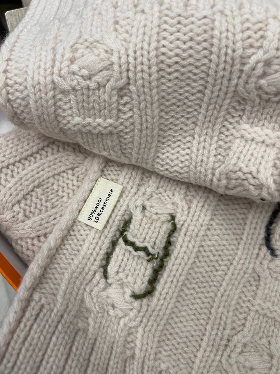 Шарф Hermes LUX-113532 - это изысканный аксессуар для создания элегантных образов в холодное время года. Шарф выполнен в нежном кремовом оттенке, украшен декоративной вязкой и вышитыми буквами бренда. Этот шарф станет отличным дополнением к любому зимнему образу.